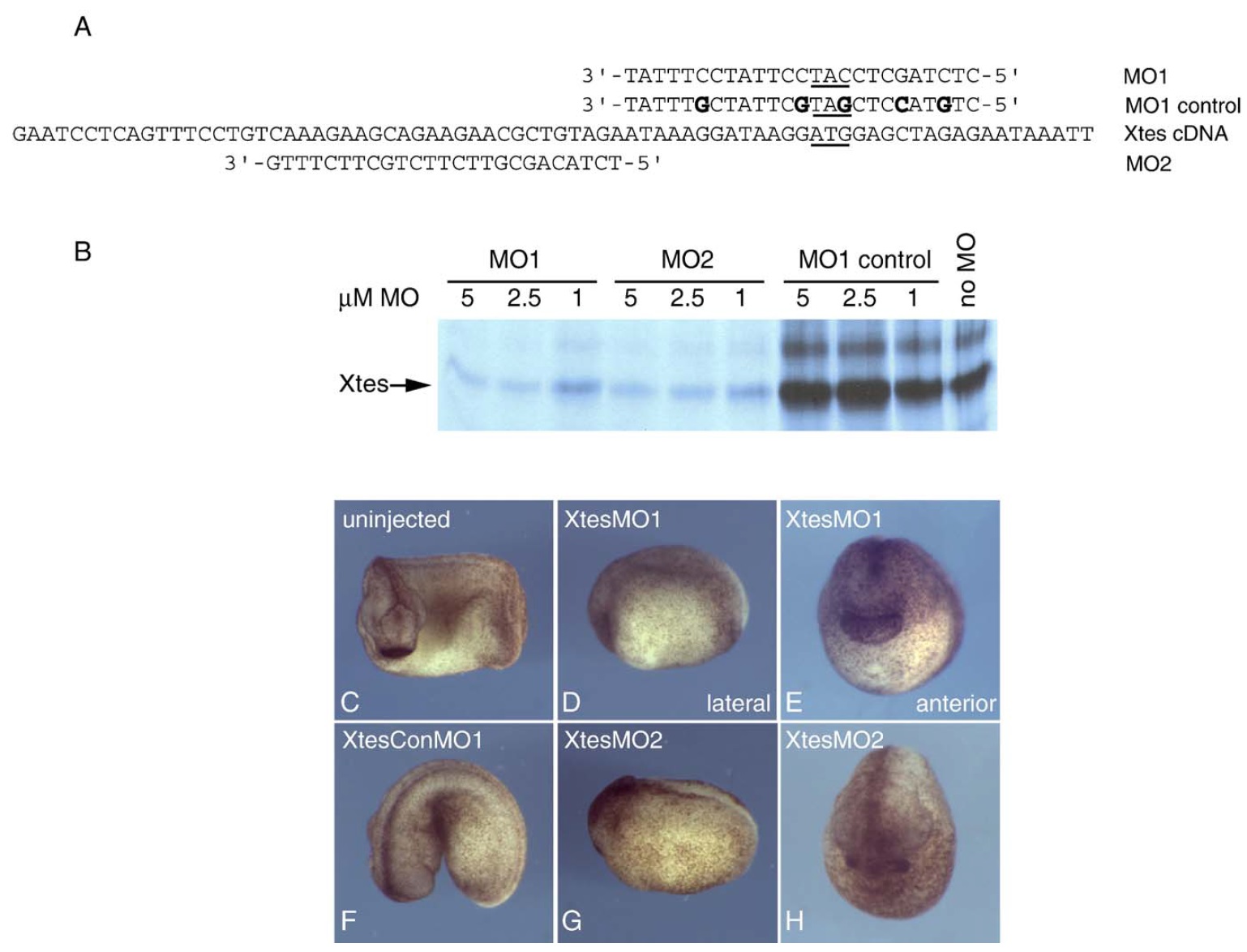 Fig. 4. Antisense morpholino oligonucleotide depletion of Xtes protein. (A) Sequences of Xtes MOs aligned with the 5â²-untranslated region (UTR) of Xtes mRNA. The