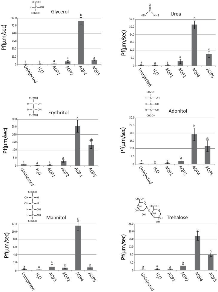 aegypti AQPs expressed in Xenopus laevis oocytes.Solute uptake was reported as an oocyte swelling rate [d(V/V0)/dt] and measured in μm/sec. There were six solutes tested, in each AQP group n = 5. The molecular structure of each solute is indicated above each graph. The means were separated by the Tukey-Kramer HSD (p < 0.05). Means which share the same letter are not significantly different.