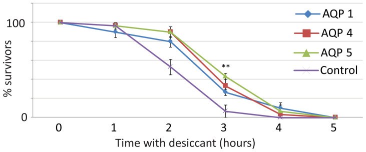 aegypti AQPs demonstrate desiccation resistance.Effect of RNAi-mediated AQP knockdown on Aedes survival under desiccation conditions. AQP 1, 4 and 5 knockdown mosquitoes have a significant increase in survival compared to the eGFP control group. Kaplan-Meier and log-rank tests were performed using Graphpad Prism software.