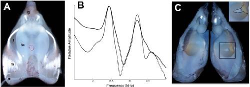 Figure 4. Harmonic dyad production is intrinsic to the isolated larynx and requires intact elastic cartilage septa.A singing male and an isolated larynx with intact elastic cartilage septa produce the same dyad in sound and laser recordings (A) Recordings from a X. boumbaensis male. Spectrograph (frequency vs time) of one pulse obtained from sound and laser vibrometry recordings. At right: Power spectra from the sound (grey) and laser (black) spectrographs. (B) Recordings from the isolated larynx of a X. boumbaensis male. Spectrograph (frequency vs time) of one pulse obtained from sound and laser vibrometry recordings, At right: Power spectra from the sound (grey) and laser (black) spectrographs. Note that the broad band frequency peak ~1 kHz in the sound recordings (gray) is not present in the laser recordings (black) and is thus an artifact of recording conditions (glass aquaria or Petri dish). Spectrographs are color graded to show increased intensity (blue to red). C - D Intact elastic cartilage is required for the production of frequency dyads. (C) Transverse section of an osmicated, epon-embedded male X. laevis larynx just anterior to the nerve (n) entry point in B; dorsal is up. The hyaline cartilage (hc) frame is flanked laterally by paired, bipennate laryngeal dilator muscles (m). Elastic cartilage sheets divide the lumen of the larynx into a central chamber (C) and two symmetrical lateral chambers (L). Elastic cartilage is recognizable by its unique, lace-like cellular morphology (inset). Scale bar 1 mm. (D) When elastic cartilage of the isolated larynx is disrupted bilaterally (red) via puncture (see Figure 1âfigure supplement 1), the two DFs characteristic of the intact larynx (in black) are replaced by a single, intermediate DF in red). |