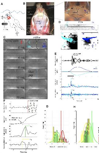 Figure 1. Arytenoid disc kinematics associated with underwater sound production in the ex vivo larynx of Xenopus laevis.(A) Xenopus call while submerged. A ventral view of a reproductively active, X. laevis male (nuptial pads in grey on the inner surface of the forearms), underwater (blue waves); larynx in red and more dorsal brain in blue. This view of the larynx is schematic (i.e. the dorsal rather than the ventral side is illustrated) in order to correspond to the actual isolated larynx in (B). On the left, an oscillogram (sound intensity vs time) of a single, biphasic call that includes a fast and slow trill. Each vertical line indicates a sound pulse; ~60 pulses/s for fast trill and ~30 pulses/s for slow trill. (B) Dorsal aspect of an isolated X. laevis larynx, a cricoid box of hyaline cartilage flanked by muscles. Each effective contraction/relaxation of these paired laryngeal muscles produces a single sound pulse. In the preparation illustrated, sound pulses are evoked by electrical stimulation of both laryngeal nerves via suction electrodes. Inset: Each muscle contraction produces a transient increase in tension on the arytenoid discs (ad) located within the arytenoid cartilages (ac) via the tendons (t). Globule cells (gc) secrete a mucopolysaccharide onto the medial surfaces of the arytenoid discs (Yager, 1992). Carbon microspheres (e.g. M1 and M2) placed on the surface of the larynx track muscle and cartilage positions. (C) Still photo of arytenoid cartilage motion filmed at 10,000 fps and illustrated at 2 ms intervals. Nerve stimulation occurs in top left image. (D) Upper panel: Higher magnification images of each bead in B) during filming at 44,000 fps. Lower panel: The small motion of each bead (cyan, left; blue, right) during 40 consecutive stimulations at 40 Hz. (E) Sound (top panel, corrected for time of flight) and the position, velocity and acceleration of the two beads (color coded as in D) during a single pulse. Nerve stimulation occurs at t = 0. (F) Kinematic data for gap width (w) in C) in relation to sound onset. While the precise onset (red line) is hard to determine due to acoustic noise, sound production follows peak velocity (green) or acceleration (yellow). (G) The timing of sound onset (red), gap peak acceleration (yellow) and peak velocity (green) during 40 consecutive clicks for one larynx relative to nerve stimulation. (H) Sound onset relative to gap peak acceleration (yellow) and peak velocity (green) during 40 consecutive clicks for the larynx in G). |