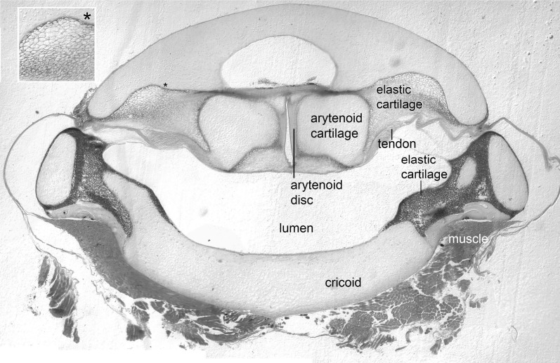 Figure 1âfigure supplement 1. The arytenoid discs are suspended in elastic cartilage.Transverse section (5 μm) through a decalcified, osmicated, epon-embedded larynx of a male X. laevis at the anterior-posterior level of the arytenoid discs (ad, Figure 1B inset); dorsal is up. As in X. borealis, (Yager, 1992) the anterior arytenoid cartilages and arytenoid discs are suspended in elastic tissue including elastic cartilage identifiable by its characteristic âSwiss-cheeseâ appearance (inset at left). Seams of elastic cartilage also insert bilaterally onto the cricoid box (cricoid), composed of hyaline cartilage, and form the septa between the lateral and medial chambers more posteriorly (illustrated in Figure 4C). Laryngeal muscle inserts via the tendon onto the arytenoid cartilages just posterior to the level of this section (see Figure 1B and inset). |