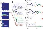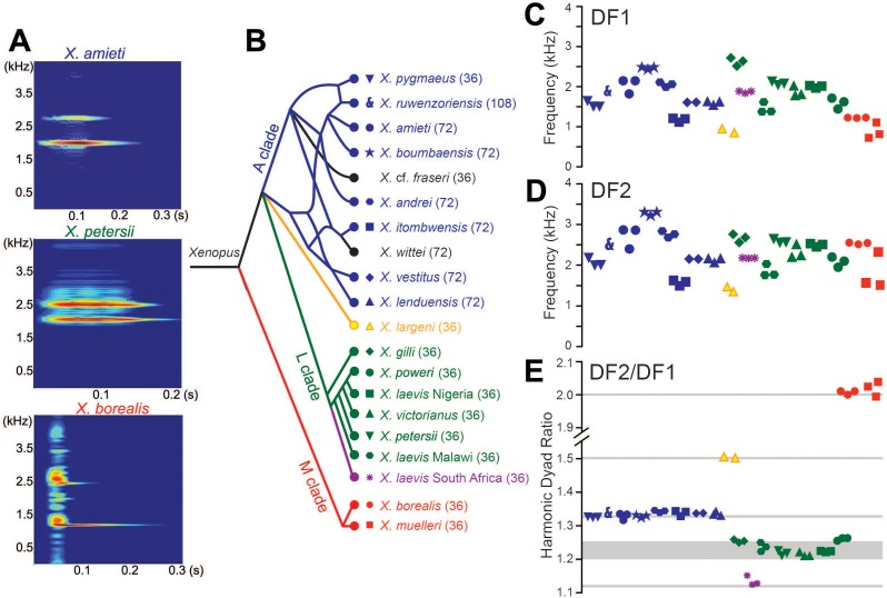 Figure 3. Harmonic dyad ratios are specific to, and highly conserved within, each Xenopus clade (blue: Clade A, green: Clade L; red: Clade M).(A) Each sound pulse in an advertisement call includes two dominant frequencies (DFs). Top: Spectrogram of multiple sound pulses in a X. amieti (A clade) advertisement call. Middle: multiple sound pulses in a X. petersii (L clade) advertisement call. Bottom: One sound pulse in a X. borealis (M clade) advertisement call. (B) Phylogenetic relationships of Xenopus species in this study. Clades and the DF2/DF1 ratios are: 1.33 (blue, A clade), 1.21–1.26 (green, L clade), and 2.0 (red, M clade). X. allofraseri (black) sound pulses are harmonic stacks. X. laevis South Africa (purple) and X. wittei (black) sound pulses are exceptions to their species group ratios. The ploidy level (number of chromosomes) is in parentheses; the DF2/DF1 (dyad) ratio for individual male calls for each species is indicated by a unique combination of symbol and color (B–E). The value of the lower dominant frequency (DF1; C) and the higher dominant frequency (DF2; D) respectively, in advertisement call sound pulses across Xenopus. (E) Harmonic dyad ratios fall into three major bands, one for each clade. |