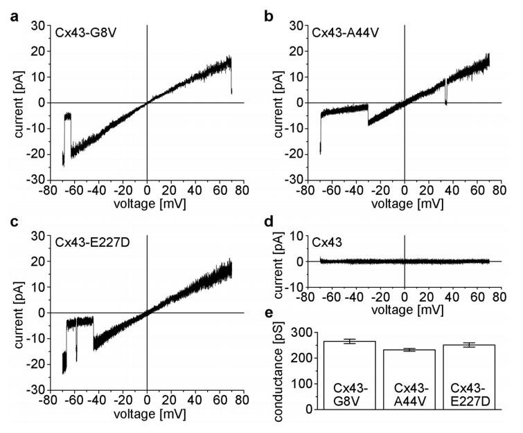 Mutations in the gene (GJA1) encoding connexin43 (Cx43) are responsible for several rare genetic disorders, including non-syndromic skin-limited diseases. Here we used two different functional expression systems to characterize three Cx43 mutations linked to palmoplantar keratoderma and congenital alopecia-1, erythrokeratodermia variabilis et progressiva, or inflammatory linear verrucous epidermal nevus. In HeLa cells and Xenopus oocytes, we show that Cx43-G8V, Cx43-A44V and Cx43-E227D all formed functional gap junction channels with the same efficiency as wild-type Cx43, with normal voltage gating and a unitary conductance of ~110 pS. In HeLa cells, all three mutations also localized to regions of cell-cell contact and displayed a punctate staining pattern. In addition, we show that Cx43-G8V, Cx43-A44V and Cx43-E227D significantly increase membrane current flow through formation of active hemichannels, a novel activity that was not displayed by wild-type Cx43. The increased membrane current was inhibited by either 2 mM calcium, or 5 µM gadolinium, mediated by hemichannels with a unitary conductance of ~250 pS, and was not due to elevated mutant protein expression. The three Cx43 mutations all showed the same gain of function activity, suggesting that augmented hemichannel activity could play a role in skin-limited diseases caused by human Cx43 mutations.