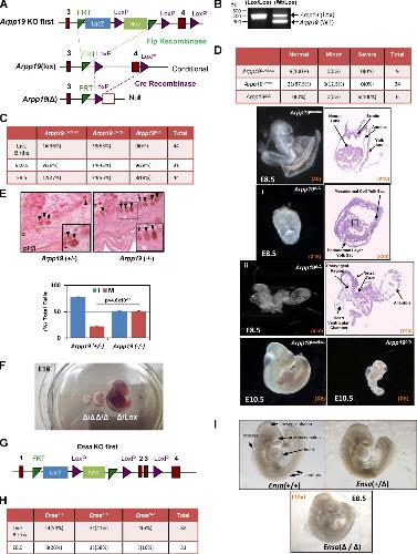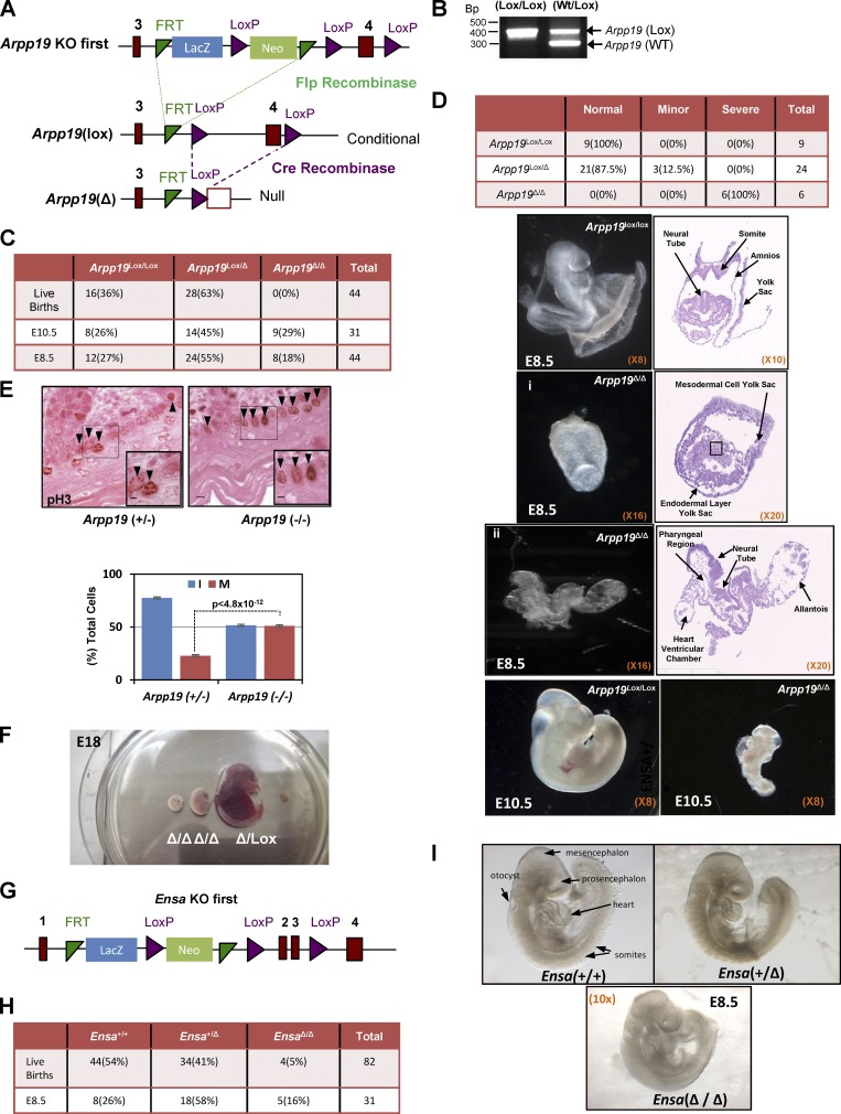 Figure 2. ARPP19, but not ENSA, is essential for embryogenesis. (A) The knockout first (KO-first) allele (Tm1a allele) was converted into a conditional allele that does not harbor the selection cassette by mating heterozygous Arpp19tm1a(KOMP)Mbp mice with Gt(ROSA)26Sortm1(FLP1)Dym/Wtsi mice. Exon 4 of the murine Arpp19 gene was then flanked by LoxP sequences (violet triangles), and Cre-mediated recombination resulted in Arpp19-null alleles. (B) Representative PCR products of WT Arpp19 and floxed alleles (Lox). (C) Number (percentage) of live births and embryos recovered at the indicated developmental stages from heterozygous crosses between Arpp19Wt/Δ mice. (D) Statistics of the different phenotypes observed for the indicated mouse genotypes. Representative images of E8.5 and E10.5 Arpp19Lox/Lox and Arpp19Δ/Δ embryos from heterozygous crosses confirmed by genotyping. Histological sections from the indicated embryos were stained with hematoxylin-eosin, and images were acquired with a transmitted light microscope. Magnifications are indicated in the images. (E) Immunohistochemical analysis of mitotic (M), phosphorylated histone H3 signal (pH3), and interphasic (I) cells in the epidermal basal layer of E17.5 Arpp19Wt/Δ and Arpp19Δ/Δ embryos. Data are the mean ± SD of two different experiments (five embryos for each genotype/experiment). Bar, 10 µm. Bar magnifications, 5 µm. (F) Representative images of E18 Arpp19Δ/Lox and Arpp19Δ/Δembryos in which Arpp19 was deleted in embryos by tamoxifen injection of pregnant Arpp19Lox/Wt PolII Cre ERT2 females at E7.5 after mating with Arpp19Lox/Lox RNApolII Cre ERT2Ki/Ki males (three experiments). (G) Schematic representation of the Ensa KO-first allele (Tm1a) that encodes LacZ instead of the ENSA protein under the control of its endogenous promoter. (H) Distribution of genotyped embryos obtained from crossing two heterozygous Ensa KO-first mice (results from three independent intercrosses). Of note, although all embryos were normal at E8.5, the genotype distribution does not follow the Mendelian ratio owing to failure of genotyping three embryos. (I) Representative light microscopy images of Ensa WT, heterozygous, and knockout E8.5 embryos obtained from mating Ensa heterozygous Tm1a mice. Magnification is indicated in the figure.