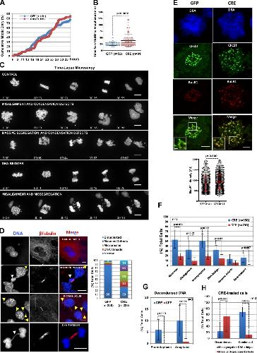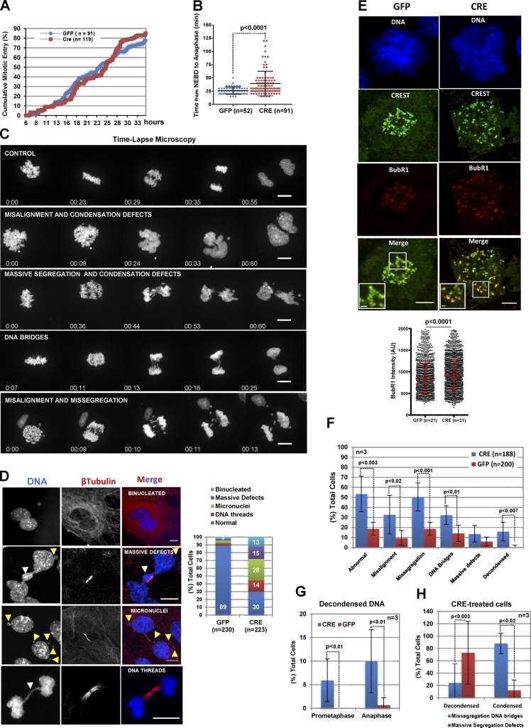 Arpp19Lox/Lox MEFs that express H2B-mCherry were transduced with GFP or GFP-Cre adenoviruses and kept in starvation conditions. After 3 d, cells were forced to reenter the cell cycle. Cell morphology and chromosomes were monitored by live microscopy every 5 min using transmitted light and 561-nm LED, respectively. The percentage of cells entering mitosis (based on cell rounding and chromosome condensation) over time was quantified by analyzing time-lapse images. (B) Mitosis duration (in minutes; mean ± SEM of four biological replicates) was calculated as the time from cell rounding and onset of chromosome condensation to chromosome segregation. (C) Mitotic progression was monitored in cells treated as in A, using live spinning-disk confocal microscopy. Representative still images of the different phenotypes observed in Videos 1, 2, 3, 4, and 5. Time after prometaphase onset is indicated. (D) Representative confocal sections of Arpp19Lox/Lox MEFs transduced with GFP or GFP-Cre adenoviruses. Bars, 10 µm. Cells exhibiting the indicated phenotypes were counted and are represented in a bar graph. (E) Cells in D were used for immunocytochemistry with anti-CREST and anti-BUBR1 antibodies and DAPI staining. Images were acquired by confocal microscopy. Spots corresponding to BUBR1 expression were automatically detected with Imaris in 3D images and manually corrected using CREST staining. The mean BUBR1 signal intensities were exported to Excel files for further analysis. The histogram shows the quantification of BUBR1 signal intensities (mean ± SD from 1,359 and 1,750 kinetochores from two biological replicates). Bars, 5 µm. Bar magnifications, 1 µm. (F) The spinning disk confocal movies from three different experiments were analyzed to quantify the number of cells displaying normal mitosis or the indicated phenotypes and are represented as the percentage of total cells (GFP or GFP-Cre). (G) Cells in C that underwent decondensation in prometaphase or after anaphase onset were counted and are represented. (H) GFP-Cre–expressing cells showing normally condensed or decondensed chromosomes were classified according to the indicated mitotic phenotypes.