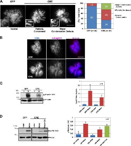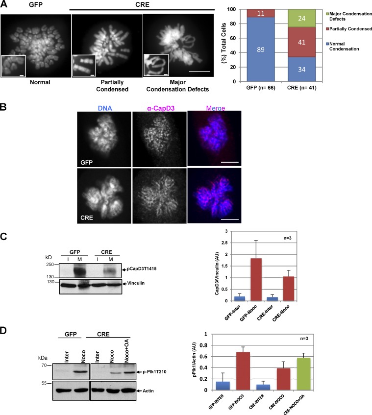 Figure 6. Partially decondensed DNA in Arpp19 knockout MEFs is associated with dephosphorylation of histone H3 and of the condensin II subunit CAPD3. (A) GFP and CRE cells were synchronized in mitosis with nocodazole, and after shake-off, chromosome spreads were prepared. Left: Representative phenotypes observed in chromosome spreads. Right: Quantification of cells displaying the indicated phenotypes. Data were from two independent experiments. (B) GFP- or GFP-Cre–transduced MEFs were used for immunofluorescence analysis with anti-CAPD3 antibodies and confocal microscopy (representative images). Bars, 5 µm. Bar magnifications, 2 µm. (C and D) Mitotically enriched GFP- or GFP-Cre–transduced Arpp19Lox/Lox MEFs were incubated or not with OA, and then lysates were analyzed by Western blotting. Band intensities from three independent experiments were normalized to the loading controls and are represented as the mean ± SD of three replicates.