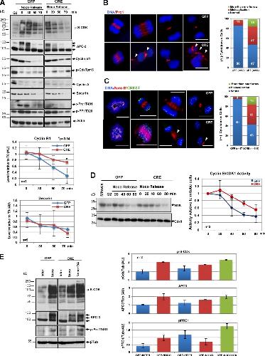Figure 7. Arpp19 ablation promotes premature dephosphorylation of key cyclin B/CDK1 substrates and disrupts the temporal order of events of mitotic exit. (A) GFP- or GFP-Cre–treated MEFs were enriched in mitosis by nocodazole and isolated by shake-off. Cells were then released and collected at the indicated time points. Cell lysates were analyzed by Western blotting. Cyclin B1 and securin levels were quantified using ImageJ and are represented relative to the G2 levels. (B and C)