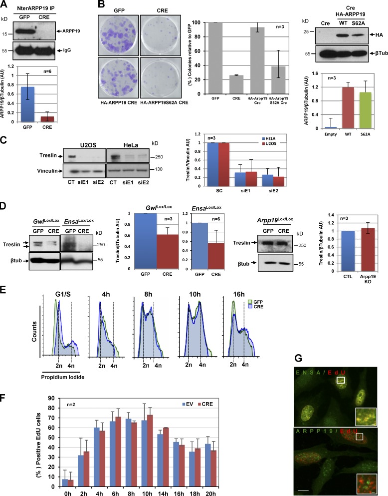 Arpp19Lox/Lox MEFs were transduced with GFP- (GFP) or GFP-Cre–expressing (CRE) adenoviruses, and GFP-positive cells were sorted by FACS. ARPP19 expression was evaluated by immunoprecipitation (IP) using the anti-NterARPP19 antibody at day 3 after viral transduction. Band intensity was quantified from six independent experiments. (B) Clonogenic assays using critical dilutions of GFP or Cre MEFs. Arpp19Δ/Δ MEFs were transiently transfected with HA-ARPP19 or the HA-ARPP19 S62A mutant. Cell colonies were counted and plotted as percentages relative to GFP cells. Values are from three different experiments. Expression of HA-ARPP19 and HA-ARPP19 S62A was confirmed by Western blotting. Band intensities measured from three different experiments. (C) HeLa and U2OS cells were transfected with scramble (CT) or with two different siRNAs against ENSA (siE1 and siE2) and processed for Western blotting. (D)