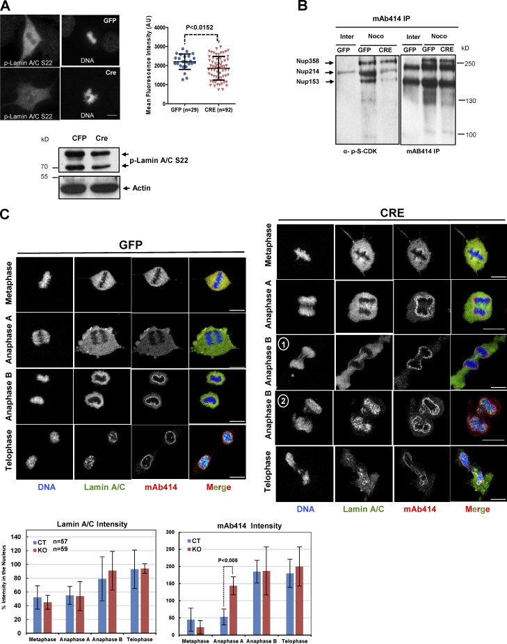 Figure 8. Arpp19 knockout perturbs the phosphorylation and localization of key nuclear envelope proteins. (A) GFP- or GFP-Cre–expressing adenoviruses were enriched in mitotic cells using nocodazole and collected for Western blotting (lower panel) or processed for immunostaining (upper left panel). The phosphorylated lamin A/C at S22 signal was quantified (upper right panel). (B) GFP or Arpp19Δ/Δ MEFs were synchronized (Noco) or not (Inter) in mitosis, lysed, and processed for immunoprecipitation (IP) using the mAB414 antibody that recognizes NUP 358, 214, 153, and 52 (Hofemeister and O’Hare, 2008). IPs were evaluated by Western blotting, using the antibody against serine phosphorylation by CDK (to detect NUP phosphorylation) and mAb414 to measure NUP levels. (C) GFP- or GFP-Cre–transduced Arpp19Lox/Lox MEFs were analyzed by confocal microscopy using the mAB414 and anti-lamin A/C antibodies. Bar, 10 µm. Lamin A/C and NUP mean intensities during mitosis progression were measured using ImageJ. A line was drawn across the DNA mass on the DAPI channel and transposed to the lamin A/C (green) and NUPs (red) channels using the region of interest plug-in. A plot profile was then constructed, and NUP intensity was measured in two points on the profile located outside and at the surface of the DNA mass. The mean values of these two points were then used to calculate the percentage of nuclear NUPs relative to the total intensity. Lamin A/C intensities were calculated as for the NUP signals except that, because of the diffuse nuclear distribution of Lamin A/C, intensities were measured outside and inside the DNA mass. Lamin A/C and NUP intensity data (mean ± SD) are from 57 GFP- and 59 GFP-Cre–transduced MEFs from three different experiments.