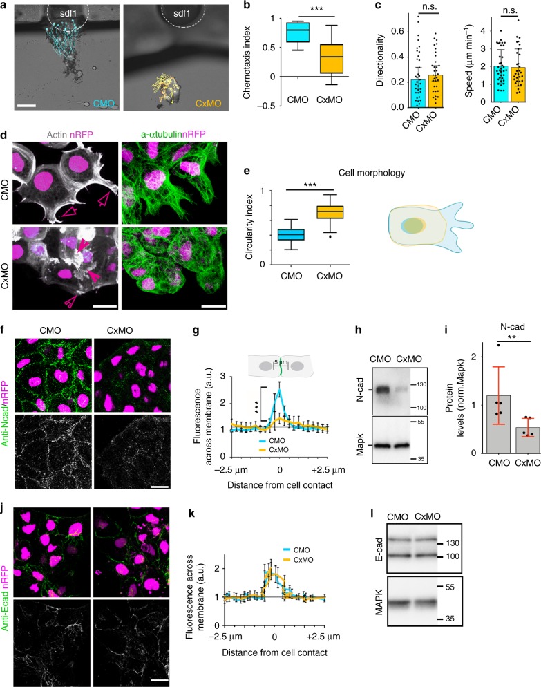 Fig. 1. Cx43 controls NC migration via N-cadherin regulation. a Neural crest chemotaxis towards SDF-1. Scale barâ=â100âμm. b Chemotaxis index (nCMO: 40, nCxMO:45 explants; Nâ=â3). c Directionality and velocity of stage 23 (st23) single neural crest cells. Neural crests were dissected and dissociated as described in Methods, followed by time-lapse imaging and tracking of individual cells (nCMO: 110, nCxMO: 115 cells, Nâ=â4), related to Supplementary Movie 1. d Neural crest cell morphology as visualized by life-actin-GFP (arrows mark normal and arrowheads irregular protrusions) and by immunostaining for α-tubulin. e Cell morphology quantification (nCMOâ=â58, nCxMOâ=â39, Nâ=â3) and diagram: control cell is shown in blue and Cx43 morphant in yellow. f N-cadherin (NCad) immunostaining of st23 neural crest. g Quantification of N-cad across the cell contact of st23 neural crest. N-cad levels, 0 represents contact point (nCTLMOâ=â25 and nCx43MOâ=â45 explants, Nâ=â3). h Western blot (WB) of st23 embryo lysates for N-cad and Mapk. i N-cad levels normalized to MAPK (nCMO: 156, nCxMO: 128 embryos, Nâ=â5). j E-cadherin (ECad) immunostaining of st23 neural crest. k Quantification of E-cad across the cell contact of st23 neural crest cells. E-cad levels, 0 represents contact point (n: 13 explants, Nâ=â3). Scale bars in d, f, and jâ=â20âμm. l WB of st23 embryo lysates for E-cad and Mapk. Box plots in b and e show the median, box edges represent the 25th and 75th percentiles, and whiskers show spread of data including outliers (Mann Whitney test p***â<â0.001) and histograms in c, i meanâ±âSE (two-tailed t test p**â<â0.01). Lines in g and k show mean and error bars represent SD (two-tailed t test p***â<â0.001). N number of independent experiments; n sample size. Spread of data in bar charts is shown as overlying dots. n.s. nonsignificant |