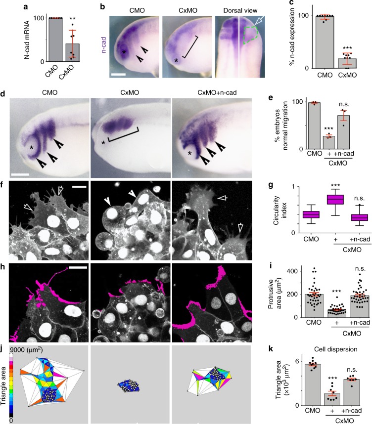 Fig. 2. Cx43 mediates N-cadherin mRNA expression. a qPCR of n-cad (nCMOâ=â68, nCxMOâ=â58 embryos, Nâ=â8). b Lateral and dorsal views of st23 embryo, analyzed by in situ hybridization ISH against n-cad, arrowheads indicate normal and bracket decreased expression, white arrow injected side and green segmented line the NC. c % of n-cad expressing embryos shown in b (nCMOâ=â178, nCxMOâ=â187 embryos, Nâ=â9). d St23 embryo showing neural crest migration by ISH for twist; normal (arrow) and impaired (brackets) migration and e % of st23 embryos with normal neural crest migration (nCMOâ=â89, nCxMOâ=â105, nCxMO-ncadâ=â124 embryos, Nâ=â3). Scales bar in b and dâ=â50âμm. f St23 neural crest cells expressing nRFPâ+âmRFP; normal (arrows) and short protrusions (arrowheads) and g cell morphology quantification (nCMOâ=â86, nCxMOâ=â87, nCxMO-ncadâ=â98 cells, Nâ=â3); Scales bar in f and hâ=â15âμm. h St23 neural crest cells expressing nRFPâ+âmRFP; in magenta lamellipodia extensions and i quantification of protrusion area, (nCMOâ=â37, nCx43MOâ=â33, nCxMO-ncadâ=â38 cells, Nâ=â3). j Cell dispersion analysis after 6âh of culture using Delauney triangulation and k its quantification (nâ=â10 NC explants, Nâ=â3). Histograms in a, c, e, i, and k represent meanâ±âSE (two-tailed t test p**â<â0.01, p***â<â0.001). In g box plots show the median, box edges represent the 25th and 75th percentiles, and whiskers show spread of data including outliers (Mann Whitney test p***â<â0.001). N number of independent experiments; n sample size. Spread of data in bar charts is shown as overlying dots. n.s. nonsignificant |