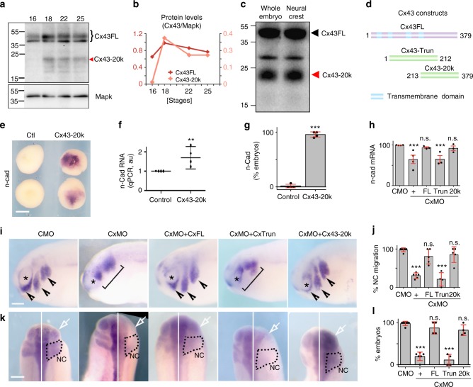 Fig. 4. Cx43 20âkDa isoform promotes N-cadherin expression. a WB showing Cx43 temporal expression. b Cx43 expression levels normalized to MAPK. Levels for Cx43 full length (Cx43FL) and Cx43-20k are plotted (nâ=â82 embryos, Nâ=â3). c Western blot against Cx43 using extracts from whole embryos (st21) and dissected neural crest (st21) (nwhole embryoâ=â20; nneural crestâ=â50 neural crests, Nâ=â3). d Diagram of Cx43 constructs used. e Blastula embryos analyzed by ISH for n-cad after the indicated treatments. Scale barâ=â70âμm. f qPCR for n-cad from blastula control embryos versus embryos expressing Cx53Tail (nControl: 89, nCx43-20k: 95 embryos, Nâ=â4) and g % of blastula embryos expressing N-cadherin mRNA analyzed by ISH (nControlâ=â62, nCx43-20kâ=â85 embryos, Nâ=â4). h qPCR for n-cad of st24 embryos (nfrom-left-to-rigthâ=â120, 118, 92, 86, 78, 92 embryos, Nâ=â4). i St24 embryos showing neural crest migration by ISH of twist; arrowheads: normal migration, brackets: impaired migration, asterisk: eye. j % of embryos with normal neural crest migration as analyzed by twist ISH of st24 embryos (nCMOâ=â115 and Nâ=â6, nCxMOâ=â116 and Nâ=â6, nCxMO+FLâ=â124 and Nâ=â5, nCxMO+Trunâ=â145 and Nâ=â4, nCxMO+Cx43-20kâ=â156 and Nâ=â5). k Dorsal view of St24 embryos analyzed for ISH of n-cad; arrows indicate injected side and black dotted area the neural crest. l % n-cad expressing embryos st24 (nCMOâ=â42 and Nâ=â6, nCxMOâ=â42 and Nâ=â6, nCxMO+FLâ=â13 and Nâ=â4, nCxMO+Trunâ=â15 and Nâ=â4, nCxMO+cx43-20kâ=â19 and Nâ=â4). Scale bars in i and kâ=â60âμm. Histograms in g, h, j, and l represent meanâ±âSE (one-way ANOVA pâ<â0.001; two-tailed t test p**â<â0.01, p*â<â0.05) n.s. nonsignificant. Dots in f show the spread of data and lines represent medianâ±âinterquartile (Mann Whitney test p**â<â0.01). N number of independent experiments; n sample size. Spread of data in bar charts is shown as overlying dots |