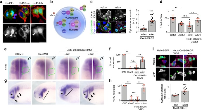 Fig. 6. Cx43 carboxy-terminal controls N-cadherin by localizing into the nucleus. a Hela cells transfected with GFP-tagged Cx43 forms as indicated (in green), red: phalloidin, blue: DAPI. Scale barâ=â25âμm. bâi Inducible construct to control nuclear localization of Cx43-20k in neural crest and Hela cells. b Diagram of Cx43-20k-GR-GFP function. GR: glucocorticoid receptor domain. When Cx43-20kGR is expressed in a cell, it binds to HSP90 which sequestrates it into the cytoplasm; upon addition of the ligand (dex: dexamethasone) Cx43-20kGR is released and it can go into the nucleus. c St23 neural crest expressing Cx43-20kGR-GFP with (+) or without (â) dxm. Note that GFP fluorescence is uniformly distributed in -dxm cells, but it becomes localized in the nucleus after dxm treatment. Chart in c shows Cx43-20kGR nuclear fluorescence normalized to the cytosolic fluorescence (nâdxmâ=â78, n+dxmâ=â89 cells, Nâ=â3). Scale barâ=â20âμm. d qPCR for n-cad of st20 embryos (Nfrom bars1â4â=â4, 4, 5, 5). e Activation of Cx43-20k nuclear localization by dxm rescues n-cad levels, analyzed by ISH for twist in embryos at st24. White arrow shows injected side and green line the neural crest. f % of n-cad expressing embryos shown in e (nCMOâ=â83, nCxMOâ=â95, nâdxmâ=â67, n+dxmâ=â64, Nâ=â4). g St24 embryos showing neural crest migration by ISH of twist; arrowheads: normal migration, brackets: impaired migration, asterisk: eye. Scale bars in e, i, and gâ=â50âμm. h % of embryos with normal neural crest migration analyzed by ISH for twist; embryos are shown in g (nCMOâ=â91, nCxMOâ=â102, nâdxmâ=â87, n+dxmâ=â93, Nâ=â5). i HeLa cells were transfected with EGFP or with Cx43-20kGR-GFP and treated with DMSO or dxm. Chart in i shows Cx43-20kGR-GFP nuclear fluorescence normalized to the cytosolic fluorescence (nâdxmâ=â56, n+dxmâ=â72 cells, Nâ=â3); Scale barâ=â25âμm. Histograms in c, d, f, h, and i represent meanâ±âS.E. (one-way ANOVA pâ<â0.001, two-tailed t test p**â<â0.01, p***â<â0.001). N number of independent experiments; n sample size. Spread of data in bar charts is shown as overlying dots. n.s. nonsignificant |