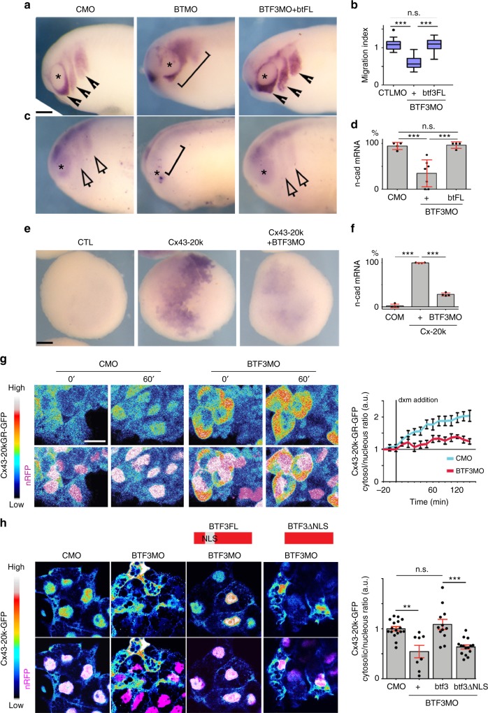 Fig. 8. Cx43 carboxy-terminal is recruited to the nucleus by BTF3. a St24 embryos showing neural crest migration by ISH of twist. Arrowheads show normal and brackets impaired migration. Asterisk indicates the eye. Scale barâ=â40âμm. b Neural crest migration index for the indicated treatment. (nCMOâ=â89, nBTF3MOâ=â98, nBTF3MO-BTF3FLâ=â105, Nâ=â4. c Lateral view of embryos at st24 showing n-cad expression, analyzed by ISH. Arrows show normal and brackets impaired expression, asterisk indicates the eye. d % of n-cad expressing embryos shown in c (nCMOâ=â92, nBTF3MOâ=â127, nbtFL+BTF3MOâ=â98 embryos, Nâ=â4). e Analysis of N-cadherin expression in blastulae embryos (st9). Scale barâ=â30âμm. f n-cad expression levels, representative embryos in e (nCMOâ=â56, nCx-20kâ=â112, nCx-20k-BTF3MOâ=â88 embryos, Nâ=â4). g Temporal analysis of Cx43-20k-GR nuclear localization in st23 neural crest after addition of dxm (time is shown in minutes after dxm treatment). Cx43-20k-GFP is shown in color-coded intensity and n-RFP is used to visualize the nucleus. Graph shows Cx43-20kGR-GFP nuclear fluorescence normalized to the cytosolic fluorescence (nCMOâ=â25, nBTF3MOâ=â32 explants, Nâ=â3). h St23 neural crest, showing color-coded intensity of Cx43-20k-GFP compared with nRFP to visualize nuclear localization. In red diagrams BTF3 NLS deletion constructs are shown. Chart of nucleus vs. cytosol ratio of Cx43-20k-GFP (nCMOâ=â25, nBTF3MOâ=â39, nBTF3MO-btf3â=â58, nBTF3MO-btf3ÎNLSâ=â58, Nâ=â3 independent experiments). Scale bars in g and hâ=â20âμm. In b box plots show the median, box edges represent the 25th and 75th percentiles, and whiskers show spread of data including outliers (Mann Whitney test p***â<â0.001). Histograms in d, f, h, and lines in g represent mean and error bars S.E. (one-way ANOVA; pâ<â0.001; two-tailed t test p**â<â0.01, p***â<â0.001. N number of independent experiments; n sample size. Spread of data in bar charts is shown as overlying dots. n.s. nonsignificant |