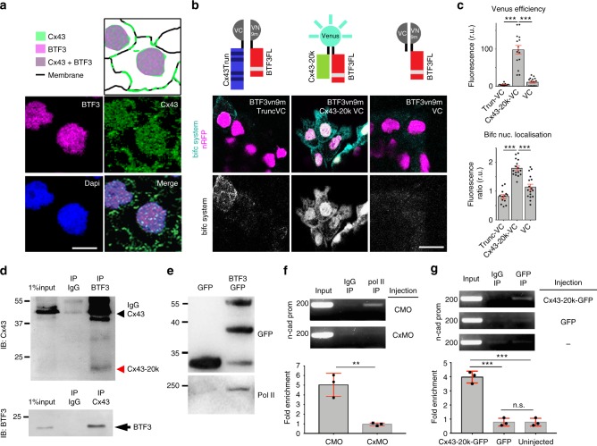 Fig. 10. Cx43 carboxy-terminal and BTF3 form a transcriptional complex. a Diagram (top) summarizing the localization of BTF3 and Cx43 in the nucleus of st23 neural crest (bottom). Anti-BTF3 (magenta), Anti-Cx43 (green) and DAPI (blue). Scale barâ=â15âμm. b Diagrams of the BiFC system. BiFC results showing that BTF3 and Cx43-20k interact in the nucleus of st23 neural crest. VENUS components coexpressed on neural crests. Scale barâ=â20âμm. c Intensity of VENUS showing the efficiency of the BiFC system in the different treatments (top) and nucleus to cytosol ratio (bottom) of BiFC signal (nTruncVCâ=â150, nCx43-20kVCâ=â147, nVCâ=â98 cells, Nâ=â3). d Co-immunoprecipitation of BTF3 and Cx43 in HeLa cells (Nâ=â4). e Co-immunoprecipitation showing biochemical interaction between BTF3 and Polymesare II (Nâ=â3). f, g ChIP experiments for n-cad promoter of st23 neural crest as indicated (f: Nâ=â3, g: Nâ=â3). Histograms in c, f, and g represent meanâ±âSE (one-way ANOVA pâ<â0. 001, two-tailed t- test p**â<â0.01, p***â<â0.001). N number of independent experiments; n sample size. Spread of data in bar charts is shown as overlying dots. n.s. nonsignificant |
