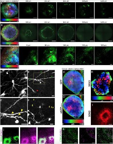 Characterization of 2Eci clearing in human cerebral organoids. (A,B) Colour-coded z-projection and representative z-slices of both 2Eci cleared (A) and uncleared (B) sparsely labelled (3% GFP+) 80-day-old cerebral organoids. 2Eci allows imaging through whole organoids. Spots of colour aggregation depict aggregations of GFP+ neuronal stem cells in neuronal rosettes, whereas maturing neurons distribute more equally throughout the organoid. (C) Detailed morphology can be observed, including neuronal rosettes (red arrowhead) and more mature neurons in a 80-day-old sparsely labelled cerebral organoid. (D-F) 3D reconstruction of multiple neurons in 80-day-old sparsely labelled cerebral organoids. (D,E) Cellular details such as cell body shape and neurites can be observed. (E) Putative dendrites (green arrowheads) and axons (red arrowheads) are maintained after clearing. (Eâ²) Magnified view of the boxed area in E reveals putative dendritic spines (yellow arrowheads). (F) Putative axonal boutons (yellow arrows) can be identified. (G,Gâ²) Colour-coded z projections of both endogenous GFP (G) and GFP antibody staining using primary and secondary antibodies (αGFP568nm) (Gâ²) in a single organoid reveal full penetration of antibodies. (H-K) Antibody labelling for a variety of neuronal markers efficiently labels different populations of cells in cerebral organoids. (H) Colour-coded z projection of a SOX2 antibody-labelled 60-day-old cerebral organoid. SOX2 is a marker for neuronal stem cells, and labels neuronal rosettes in cerebral organoids. (I) Higher magnification of a SOX2+ neuronal rosette in a cerebral organoid. (J,K) Staining for dorsal forebrain progenitors (J) (FOXG1+, PAX6+) as well as early (CTIP2+) and late (SATB2+) born cortical neurons (K). The lumen of the neuronal rosette is marked with a yellow dashed line; the ventricular zone is marked with a white dashed line. Scale bars: 500â µm in A,B; 50â µm in C; 10â µm in D-F; 500â µm in G-H; 50â µm in I-K.