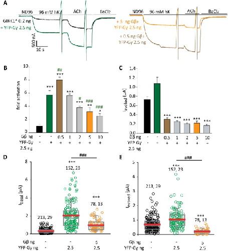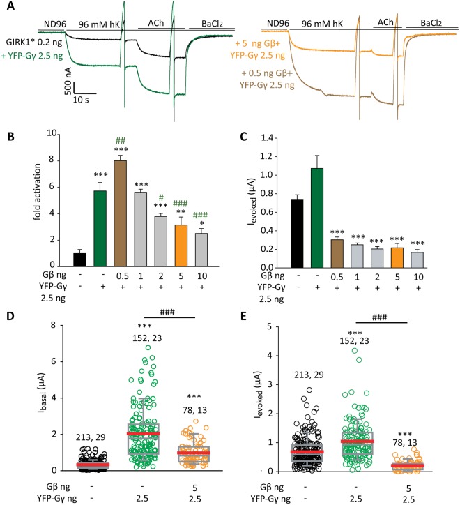 Figure 5. Complex stoichiometric relationships between Gγ and Gβ. (A–C) show one experiment in which RNA of Gβ was varied whilst RNA of YFP-Gγ was constant, 2.5 ng RNA/oocyte. m2R (1 ng RNA) was coexpressed in all cases. (A) Representative current records in oocytes expressing GIRK1* (0.2 ng RNA) alone or with YFP-Gγ, without or with Gβ (0.5 or 5 ng RNA). Note that the basal current was larger when YFP-Gγ was coexpressed with 0.5 ng Gβ than with 5 ng Gβ RNA. The sharp deflections in traces are currents elicited by voltage ramps used to obtain current-voltage curves, which are not shown. (B) Summary of fold activation of GIRK1* (0.2 ng RNA) by Gβγ or Gγ. n = 7 to 9 oocytes in each group, N = 1 experiment. Statistical analysis: asterisks * show difference from channel alone, pound signs # show difference from GIRK1 + YFP-Gγ (without Gβ). Compared to YFP-Gγ alone, coexpression of 0.5 ng Gβ significantly increased Ibasal (p = 0.003) but coexpression of 5 ng Gβ reduced it (p < 0.001). One-way ANOVA (normal distribution) followed by Dunnett’s test. (C) Summary of Ievoked. Expression of Gγ alone significantly elevated Ievoked (p < 0.001 by t-test). Comparison of groups expressing Gβ and Gγ vs. GIRK1* + YFP-Gγ (green bar) was done using one-way ANOVA followed by Dunnett’s test. ***p < 0.001. (D,E) show summary of the effects of YFP-Gγ vs. Gβ + YFP-Gγ on Ibasal and Ievoked of GIRK1* (0.2 ng RNA) from all experiments described in this report. Numbers at the top are n, N (number of cells, number of experiments). Statistical analysis: one-way ANOVA followed by Dunn’s test. ***p < 0.001 relative to GIRK1*alone. T-test was done to compare between GIRK1* co-expressed with YFP-Gγ vs. GIRK1* with Gβ + YFP-Gγ; ###p < 0.001. |