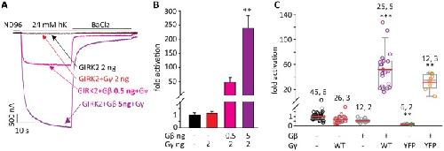 Figure 6. Gγ does not activate GIRK2. (A) Representative currents of GIRK2 (2 ng RNA) with two different concentrations of Gβ RNA and a fixed concentration of Gγ RNA, 2 ng/oocyte. (B) Summary the representative experiment shown in A, showing fold activation by Gγ or Gβγ in each group. One-way ANOVA followed by Dunn’s test. *, p < 0.05 relative to GIRK2 alone. n = 5–6 cells in each group; N = 1. (C) Summary of effects of Gβ, Gβγ, Gγ and YFP-Gγ from this series of experiments. RNA doses, in ng/oocyte, were: GIRK2, 2; Gγ, 1 or 2; Gβ, 5; YFP-Gγ, 2.5. Numbers above data sets are n, N (number of cells, number of experiments). Statistical analysis: one-way ANOVA followed by Dunn’s test. **p < 0.01, ***p < 0.001 relative to GIRK2 alone. |