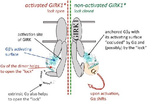 Figure 10. A hypothetical scheme of regulation of a GIRK channel containing the GIRK1 subunit by Gγ. In GIRK1-containing channels, Gβγ or the Gαβγ heterotrimer (shown in the figure) may be anchored to GIRK. In the resting state, the interaction surface of Gβ is occluded by Gα and cannot contact the activation site of GIRK. Lock element (encompassing the G1-dCT and other unknown parts of the channel) is closed, reducing channel activity. Upon activation by agonist, the GPCR (not shown) activates the G protein causing dissociation of Gα from Gβγ, exposing the GIRK-interacting surface of Gβ. Gβγ may now bind to the activation site. We propose that, at the same time, Gγ interacts with a channel’s element and helps to release the inhibitory effect of the “lock”. Exogenous Gγ may mimic this action without activating the channel by itself, but only if Gβγ is present. |