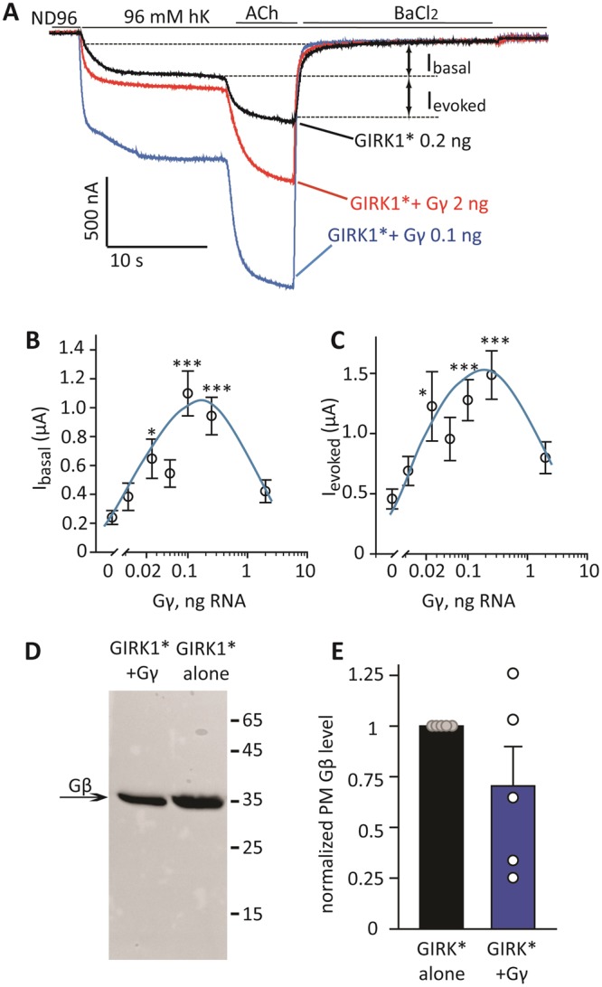 Figure 1. Expression of Gγ increases Ibasal and Ievoked of GIRK1 without increasing the surface level of Gβ. (A) Representative records of GIRK currents showing that expression of Gγ (0.2 and 2 ng RNA/oocyte) increases Ibasal and Ievoked of GIRK1*. GIRK1* was expressed at 0.2 ng RNA/oocyte together with m2R, 1 ng RNA/oocyte. Currents were first measured in a low-K+ solution (ND96) which was switched to the high K+ solution (hK, 96 or 24 mM K+, see Methods) resulting in an inward basal current, IhK. Then the oocyte was perfused with hK solution containing 10 µM ACh, to produce Ievoked. At the end, 5 mM BaCl2 was added to the solution to block GIRK currents and to reveal the residual non-GIRK current, Iresidual. Ibasal is defined as IhK-Iresidual, Ievoked as the net additional inward current evoked by ACh. Here Ibasal and Ievoked are shown graphically for the control (GIRK1*) record. In Gγ- or Gβγ-expressing oocytes, the basal current is termed Iγ or Iβγ, respectively, and defined as IhK-Iresidual. (B,C) Dose-dependence of the Gγ effect on Ibasal and Ievoked. Increasing doses of Gγ RNA were injected, together with fixed amounts of RNAs of GIRK1* and m2R (same experiment as in A). Each point shown mean ± SEM, n = 9 to 16 cells, N = 1 experiment. *p < 0.05; **p < 0.01, ***p < 0.001. (D) Expression of Gγ does not alter the levels of Gβ attached to the PM. The image shows Western blot of manually separated PMs (equal amounts of oocytes were used for each lane; here 25 oocytes/lane). The image was cropped from a larger one shown in Supplementary Fig. S1. Oocytes were injected with 0.2 ng of GIRK1* RNA, with or without 0.2 ng Gγ RNA. (E) Summary of 5 experiments (N = 5) of the kind shown in (D). In each experiment, the Gβ signal measured from the lane of Gγ-containing oocytes was normalized to Gβ signal of control oocytes expressing GIRK1* only. Bars represent mean ± SEM, circles show the results of individual experiments. There was no statistical difference in Gβ level with or without coexpressed Gγ, p = 0.167. |