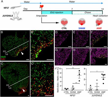 Fig. 3. Increased DNA synthesis is observed in tadpole and juvenile cardiomyocyte nuclei after heart amputation. (A) DNA synthesis in cardiomyocytes was assessed in amputated tadpole and juvenile hearts using EdU treatment for 1 wk (pulse), followed by a 1-wk chase period. (B and C) Immunolabeling with Mef2 antibody (green) and EdU detection (red) at 14 dpa. DNA synthesis in cardiomyocytes, characterized by colabeled Mef2+/EdU+ (yellow) nuclei, are observed in both tadpole (B, and magnification Bâ²) and juvenile hearts (C, and magnification Câ²); arrowheads indicate the areas magnified in Bâ² and Câ². (DâJ) Mef2+ (converted to purple dots) and Mef2+/EdU+ (converted to yellow dots) nuclei were quantified in one-third of the ventricle at the apex for tadpoles (DâF) and juveniles (GâI): white lines define the corresponding one-third area analyzed for the tadpole (B) and the juvenile (JUV) (C) (see SI Appendix, Fig. S5 for remaining two-thirds quantification). Analyses were performed for nonoperated animals (CTRL, D and G), animals operated without (SHAM, E and H) and with ventricular resection (AMP, F and I). The ratio of colabeled nuclei (Mef2+EdU+) over total number of cardiomyocyte nuclei (Mef2+) was calculated (J). All samples were obtained from two independent experiments. n ⥠3 for each group and â¥3 sections were quantified for each sample, and graphed, representing mean with SEM. NF57 values were normally distributed, therefore a one-way ANOVA followed by Sidakâs multiple comparisons test was performed. A normal distribution was not observed for JUV; therefore a nonparametric KruskalâWallis test followed by a Dunnâs multiple comparisons test was performed (*P < 0.05; **P < 0.01). (Scale bars, 100 μm.) |