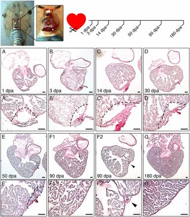 Fig. 1. Transient fibrotic response followed by complete ventricle rebuilding after cardiac resection in tadpole heart. (Top) Cardiac resection was performed on prometamorphic NF57 X. laevis tadpoles by dissecting the abdominal skin and opening the pericardium, then removing â¼10â15% of the ventricle toward the apex. Hearts were collected at 1, 3, 14, 30, 50, 90, and 180 dpa. (AâG) PSR histological labeling reveals an intensification of fibrotic connective tissue up to 14 dpa at the site of amputation (labeled in dark red). From 30 dpa up to 90 dpa, the fibrotic zone regressed and progressively disappeared as the ventricle apex regained a normal morphology, and was strongly reduced or undetectable after 90 (F2 and F1, respectively) or 180 dpa (G). (Aâ²âGâ²) Higher magnifications, with dotted lines indicating amputated area and arrows indicating the amputation site. (Scale bars, 100 μm.) |