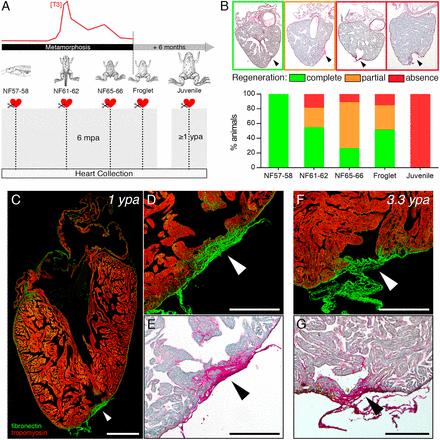 Fig. 2. Cardiac regenerative capacity is reduced then permanently lost after metamorphosis. (A) Cardiac resection was performed at different developmental stages before, during, and after TH-dependent metamorphosis: prometamorphic stages (NF57–58), climax (NF61–62), end (NF65–66), and just after metamorphosis (froglet), and in 6-mo-old juveniles. Hearts were collected 6 mpa for metamorphic stages (NF57 to froglet), and ≥1 ypa for juveniles. (B) Using PSR histological staining, hearts were categorized and quantified according to different heart phenotypes observed: fully regenerated (green: no fibrotic tissue present at the amputated site), partially regenerated (orange: fibrotic tissue remaining present at the amputated site), and those displaying an absence of regeneration (red: strong appearance of a fibrotic scar at the amputated site); arrowheads indicate the amputation site. All samples were obtained from more than four independent experiments: NF57–58, n = 4; NF61–62, n = 15; NF65–66, n = 8; froglet, n = 6, juvenile, n = 7. Immunolabeling (C and D) fibronectin (green), tropomyosin (red), and PSR staining (E) of a juvenile heart at 1 ypa (n = 5) displaying a clear presence of invasive fibrotic tissue at the amputation site (arrowhead). Immunolabeling (F) and PSR staining (G) of a juvenile heart at 3.3 ypa (n = 2) still showing a strong presence of fibrotic tissue and, hence, a persistent scar at the amputation site (arrowhead). (Scale bars, 1 mm inC and 0.5 mm in D–G.) |
