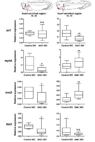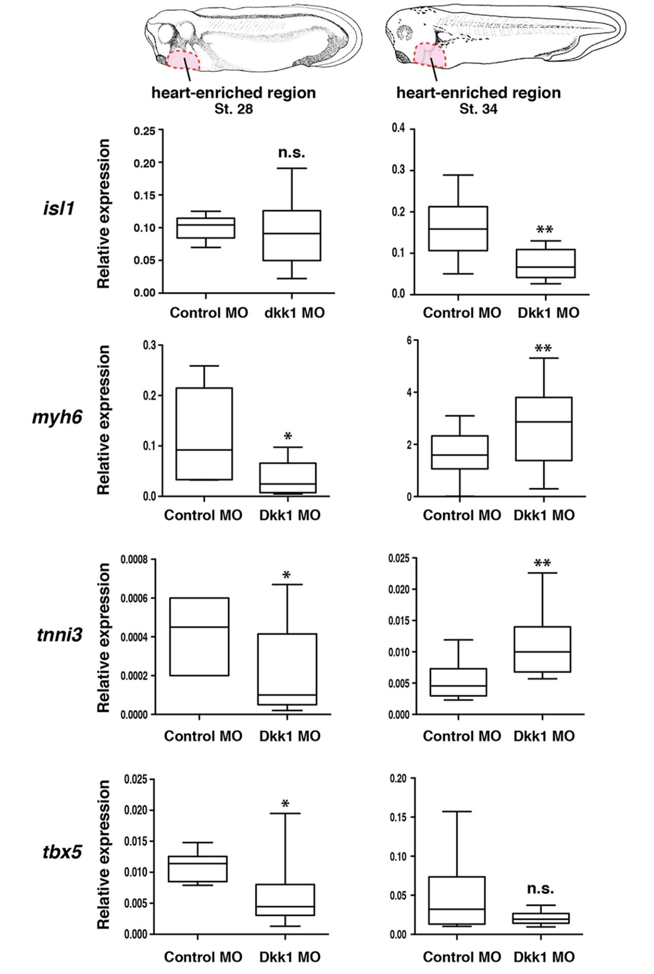 Fig. 6. The expression of differentiation cardiac markers is delayed upon loss of Dkk1. Heart-enriched explants as illustrated on the top (marked in pink) were isolated from stage 28 and 34 embryos bilaterally injected with either Control MO or Dkk1 MO. Expression of cardiac marker genes in these explants was analyzed by real-time RT-PCR and presented as relative expression to gapdh. Median values are given. The whiskers indicate the maximum and minimum values. n = number of independent experiments (n = 5â10). *p < 0.05, **pâ¯<â¯0.01, n.s. not significant with Mann-Whitney rank sum test. |