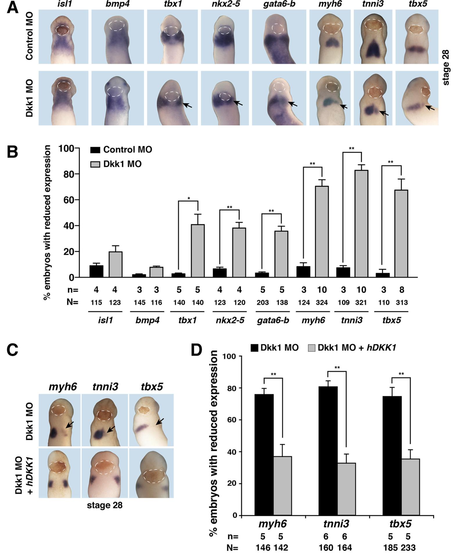 Fig. 5. The expression of differentiation cardiac markers is downregulated upon loss of Dkk1 and can be rescued by co-injection of Dkk1 MO and human DKK1. A. Front view embryos of stage 28 showing reduced expression of cardiac marker genes on MO injected side (black arrow). Control MO or Dkk1 MO was injected unilaterally at the dorsal-vegetal site in embryos at stage 4. Un-injected side served as internal control. Data quantification is shown in B. C. Co-injection of Dkk1 MO and human DKK1 restore the reduced expression (black arrow) of markers as shown in stage 28 embryos of front view. Data quantification is presented in D. White dotted lines indicate the cement gland. Mean values with standard errors are given. n = number of independent experiments, N = total number of embryos analyzed. *p < 0.05, **pâ¯<â¯0.01 with Mann-Whitney rank sum test. |