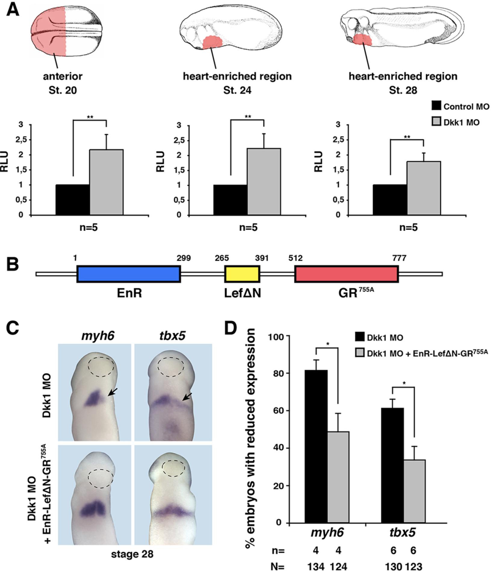 Fig. 7. Wnt/β-catenin activity is increased in the developing heart and inhibition of Wnt/β-catenin signaling rescues loss of Dkk1 phenotype. A. Wnt/β-catenin activity was monitored in the developing heart tissue (marked in pink) isolated from embryos at indicated stages. B. Schematic representation of EnR-LefδN-GR755A construct. Upon injection of this construct into embryos, the expression of LefδN can be induced to inhibit Wnt/β-catenin signaling by adding dexamethasone. C. Expression of cardiac differentiation markers was analyzed in embryos at stage 28 (black arrow). Dotted lines indicate the cement gland. Inhibition of Wnt/β-catenin signaling from stage 20 rescued loss of Dkk1 phenotype in unilaterally injected embryos. n = number of independent experiments, N = total number of embryos analyzed. Mean values with standard errors are given. *p < 0.05, **pâ¯<â¯0.01 with Mann-Whitney rank sum test. |