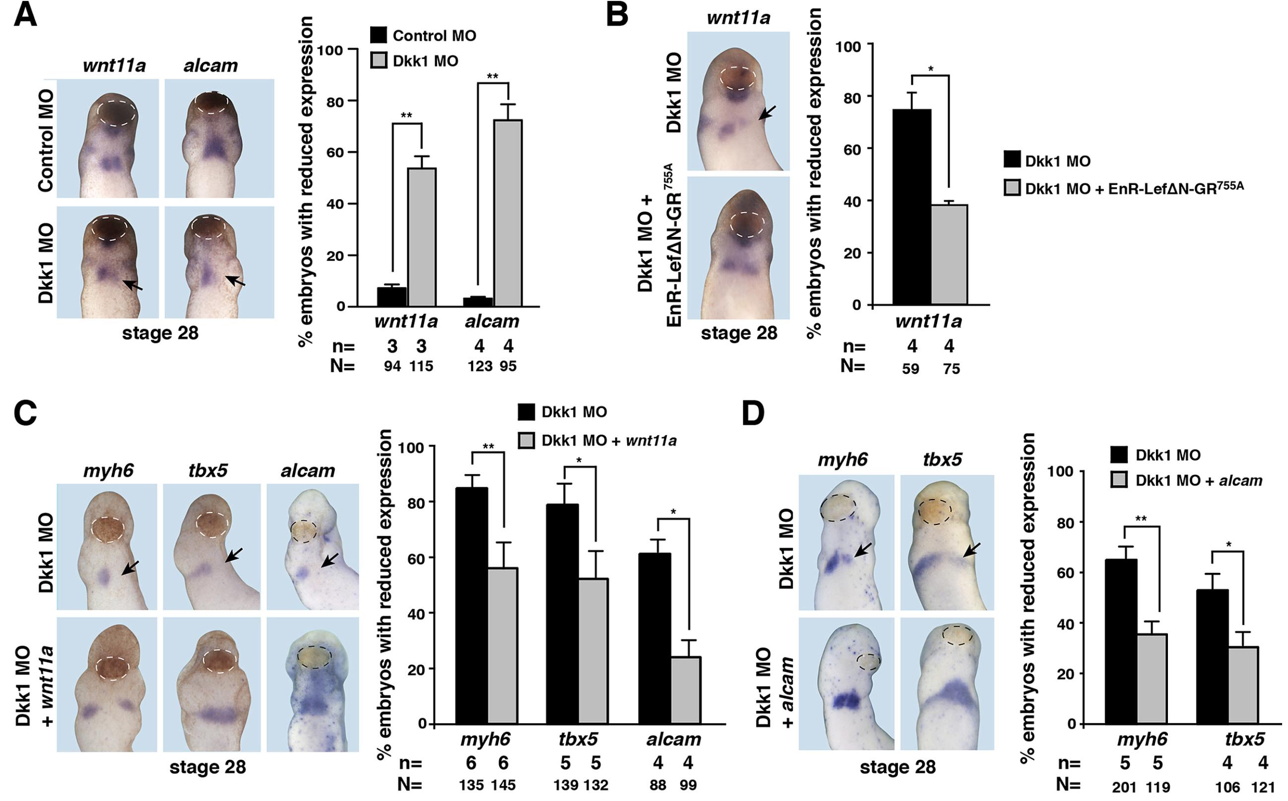 Fig. 8. Wnt11a signaling acts downstream of Dkk1 during early cardiogenesis. A. Front view of stage 28 embryos showing the reduced expression of wnt11a and alcam upon unilateral Dkk1 knockdown (black arrow). White dotted lines indicate the cement gland. B. Co-injection of Dkk1 MO with alcam restored the expression of cardiac marker genes (black arrow) at stage 28. C. Co-injection of Dkk1 MO with wnt11a rescued the expression of cardiac marker genes (black arrow) at stage 28. D. Reduced expression of wnt11a by Dkk1 MO injection is restored by inhibiting Wnt/β-catenin signaling. Quantifications are shown next to the image of the embryos. Black dotted lines indicate the cement gland. n = number of independent experiments, N = total number of embryos analyzed. Mean values with standard errors are given. *p < 0.05, **pâ¯<â¯0.01 with Mann-Whitney rank sum test. |