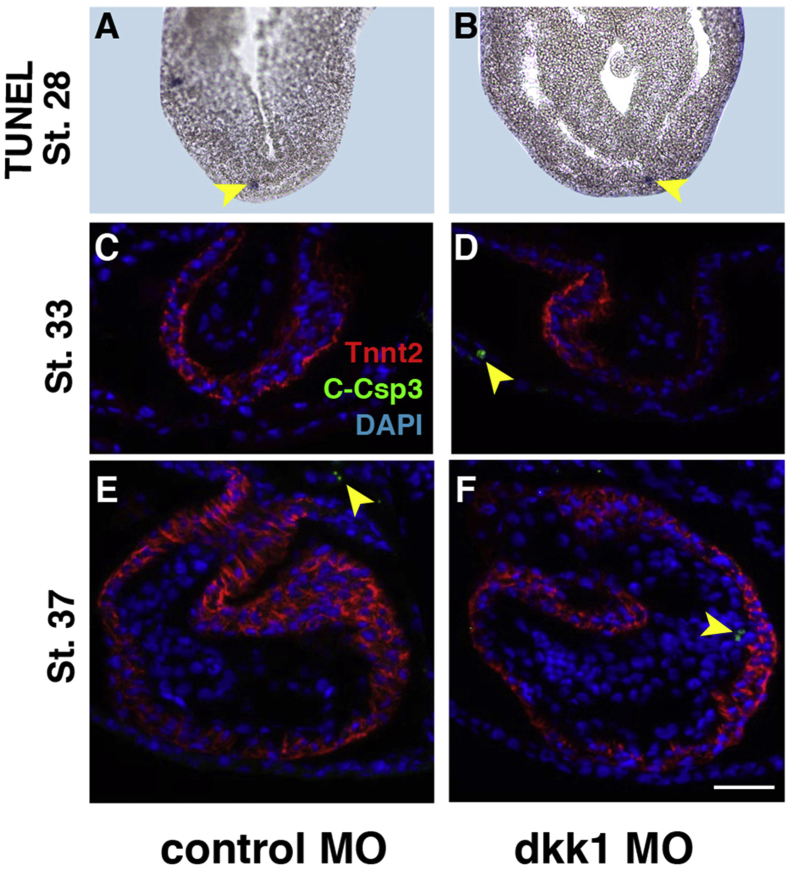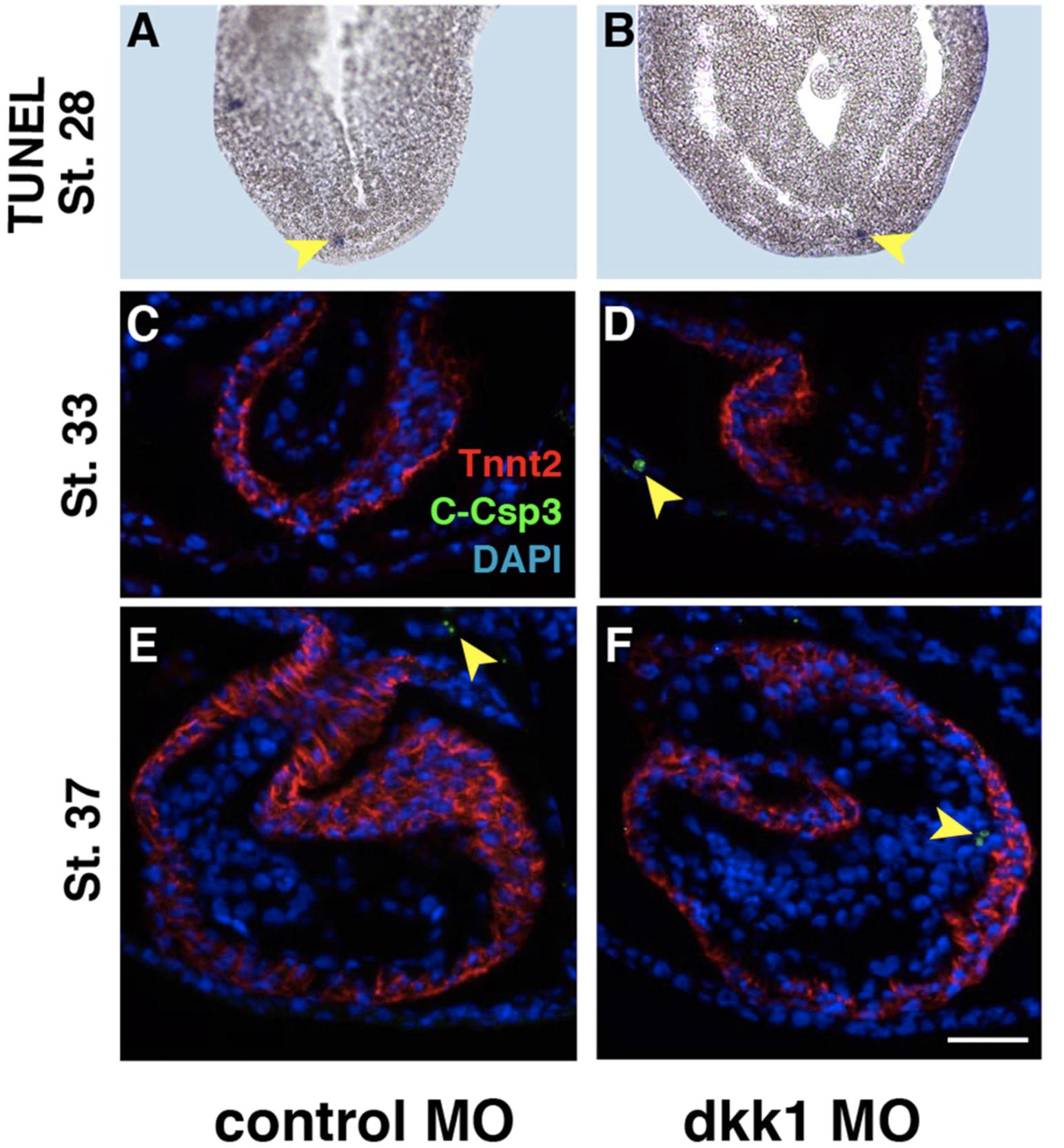 Supplement Fig. 3: Loss of Dkk1 does not result in apoptosis A,B. Apoptotic cells were stained at stage 28 by TUNEL assay. Only few apoptotic cells were detected on sections as indicated by the yellow arrowhead. No difference between Control MO and Dkk1 MO injected embryos was observed. C-F. Apoptotic cells were detected by immunofluorescence staining against cleaved caspase 3 (C-Csp3) followed by serial sections. Cardiomyocytes were detected by cardiac troponin T staining (Tnnt2). Nuclei were counterstained with DAPI. Only few apoptotic cells were detected at stage 33 (C,D) or 37 (E,F) as labelled by the yellow arrowhead. Scale bar, 100 µm. |