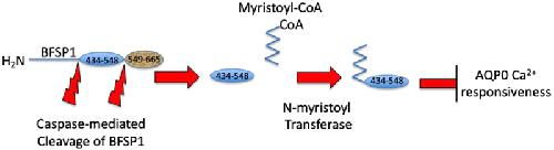 BFSP1 (beaded filament structural protein 1, filensin) is a cytoskeletal protein expressed in the eye lens. It binds AQP0 in vitro and its C-terminal sequences have been suggested to regulate the water channel activity of AQP0. A myristoylated fragment from the C-terminus of BFSP1 was found in AQP0 enriched fractions. Here we identify BFSP1 as a substrate for caspase-mediated cleavage at several C-terminal sites including D433. Cleavage at D433 exposes a cryptic myristoylation sequence (434-440). We confirm that this sequence is an excellent substrate for both NMT1 and 2 (N-myristoyl transferase). Thus caspase cleavage may promote formation of myristoylated fragments derived from the BFSP1 C-terminus (G434-S665). Myristoylation at G434 is not required for membrane association. Biochemical fractionation and immunogold labeling confirmed that C-terminal BFSP1 fragments containing the myristoylation sequence colocalized with AQP0 in the same plasma membrane compartments of lens fibre cells. To determine the functional significance of the association of BFSP1 G434-S665 sequences with AQP0, we measured AQP0 water permeability in Xenopus oocytes co-transfected with transcripts expressing both AQP0 and various C-terminal domain fragments of BFSP1 generated by caspase cleavage. We found that different fragments dramatically alter the response of AQP0 to different concentrations of Ca2+. The complete C-terminal fragment (G434-S665) eliminates calcium regulation altogether. Shorter fragments can enhance regulation by elevated calcium or reverse the response, indicative of the regulatory potential of BFSP1 with respect to AQP0. In particular, elimination of the myristoylation site by the mutation G434A reverses the order of water permeability sensitivity to different Ca2+ concentrations.