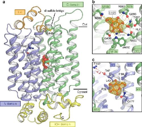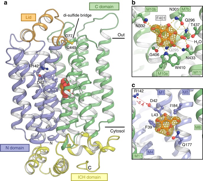 Fig. 1. Structure of the high affinity Sugar Transport Protein STP10. a The structure represents an outward facing occluded state of the sugar transporter in complex with glucose. Glucose (shown as spheres) is buried in the membrane at the interface between the N domain (blue) and C domain (green). Selected residues are shown as sticks. Black bars depict the approximate location of the membrane. b The glucose binding site towards the C domain. Yellow dashes indicate hydrogen bonds (2.6–3.6 Å distances) to glucose. The omit mFobs-DFcalc density for glucose is contoured in gold (5σ). c Same as panel b for the glucose binding site towards the N domain