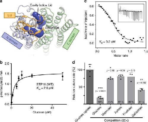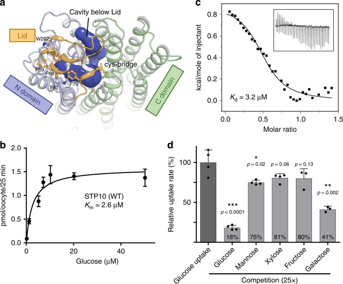 Fig. 2. Functional characterization of STP10. a Glucose access from the extracellular side is blocked by the Lid domain covalently linked to the C domain. b Michaelis-Menten fit to glucose titration of STP10 using a Xenopus oocyte uptake assay at pH 5.0. c Binding affinity between glucose and STP10 by Isothermal titration calorimetry at pH 5.5. d Substrate specificity determined by competition in a yeast uptake assay at pH 5.0. *Pâ<â=â0.05; **Pâ<â=â0.01; and ***Pâ<â=â0.001 by Studentâs t test. Data for all assays are meanâ±âSD of three or more replicate experiments