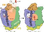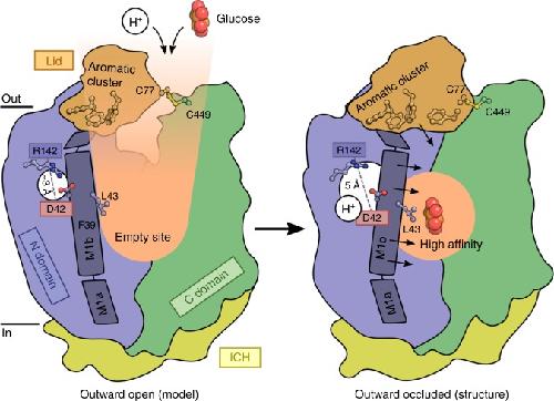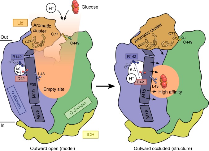 Fig. 4. Proposed mechanism of glucose coupling to proton donor/acceptor site. In the outward open conformation (left), protons and glucose enter the central binding sites through small rearrangements of the N domain and the Lid domain that is covalently linked to the C domain through Cys77-Cys449. Protonation of Asp42 leads to its repulsion away from Arg142 and pushes the flexible M1b towards the glucose binding site, giving preference to high affinity glucose binding through Phe39 and Leu43 (right, observed structure). The aromatic cluster of the lid helps to isolate the proton donor/acceptor pair and maintain pKa values of Asp42 conductive to transport at a broad range of pH values