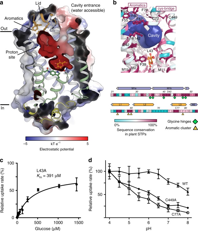 Fig. 3. The Lid domain and its effect on transport. a Electrostatic surface representation showing the negative cavity that connects the proton donor/acceptor site with the glucose binding site. A cluster of aromatic residues on the Lid domain isolate the proton site from the extracellular side. b Conservation of the aromatic residues of the Lid domain and residues of the proton donor/acceptor site and M1b. Both structure and sequence is colored according to sequence conservation between 1336 unique STPs (35–95% seq. ID) found across plant species. c Michaelis-Menten fit to glucose titration of STP10 mutant L43A at pH 4.0. d Glucose uptake rate as determined by a yeast uptake assay at different pH for WT STP10 and mutants C77A and C449A. Data for all assays are mean ± SD of three or more replicate experiments