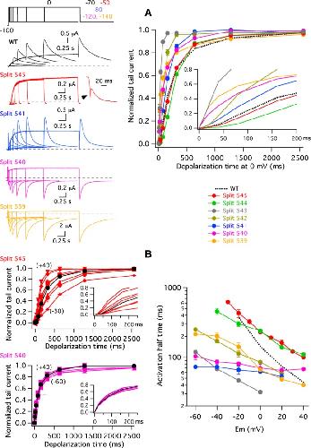 Fig. 2. Effect of split position displacement on Kv11.1 split voltage-dependent activation rates. a Comparison of time course of current activation at 0Â mV. Families of representative membrane currents from individual oocytes (left). The duration of a depolarizing prepulse to 0Â mV was varied as illustrated in the envelope-of-tail currents protocol at the top, illustrative of that used with WT channels, followed by a repolarization step to the indicated potentials (ââ70, ââ50, ââ80, ââ120 and ââ140Â mV for WT, split 545, split 541, split 540 and split 539 variants, respectively). Cells expressing split 539 and split 540 channels were held at ââ140 and ââ120Â mV trying to ensure that they also start in deactivated state. An enhanced view of the very rapidly deactivating split 545 tail current at the end of the 2560-ms depolarizing step is shown in the inset. Averaged plots of normalized tail current magnitudes versus depolarization time at 0Â mV (right). Values from continuous wild-type channels are shown as a dotted line for comparison. An expansion of the initial 200Â ms to highlight the progressive disappearance of the early current delay in the sigmoidal activation time course is shown in the inset. b Comparison of activation rate voltage dependence. Plots of normalized tail current magnitudes versus depolarization times at voltages between ââ30 and +â40Â mV (split 545) or ââ60 and +â40Â mV (split 540) at 10 and 20Â mV intervals were generated from current traces as indicated in a (left). These plots were used to measure times necessary to attain half-maximum current magnitudes (dotted lines). Expanded views of the initial 250Â ms of the plots are shown in the insets. Data obtained at 0Â mV are represented in black. Dependence of activation rates on depolarization membrane potentials (right). The time necessary to attain half-maximum tail current magnitude is plotted versus depolarization potential. Values from continuous wild-type channels are shown as a dotted line for comparison |