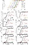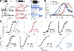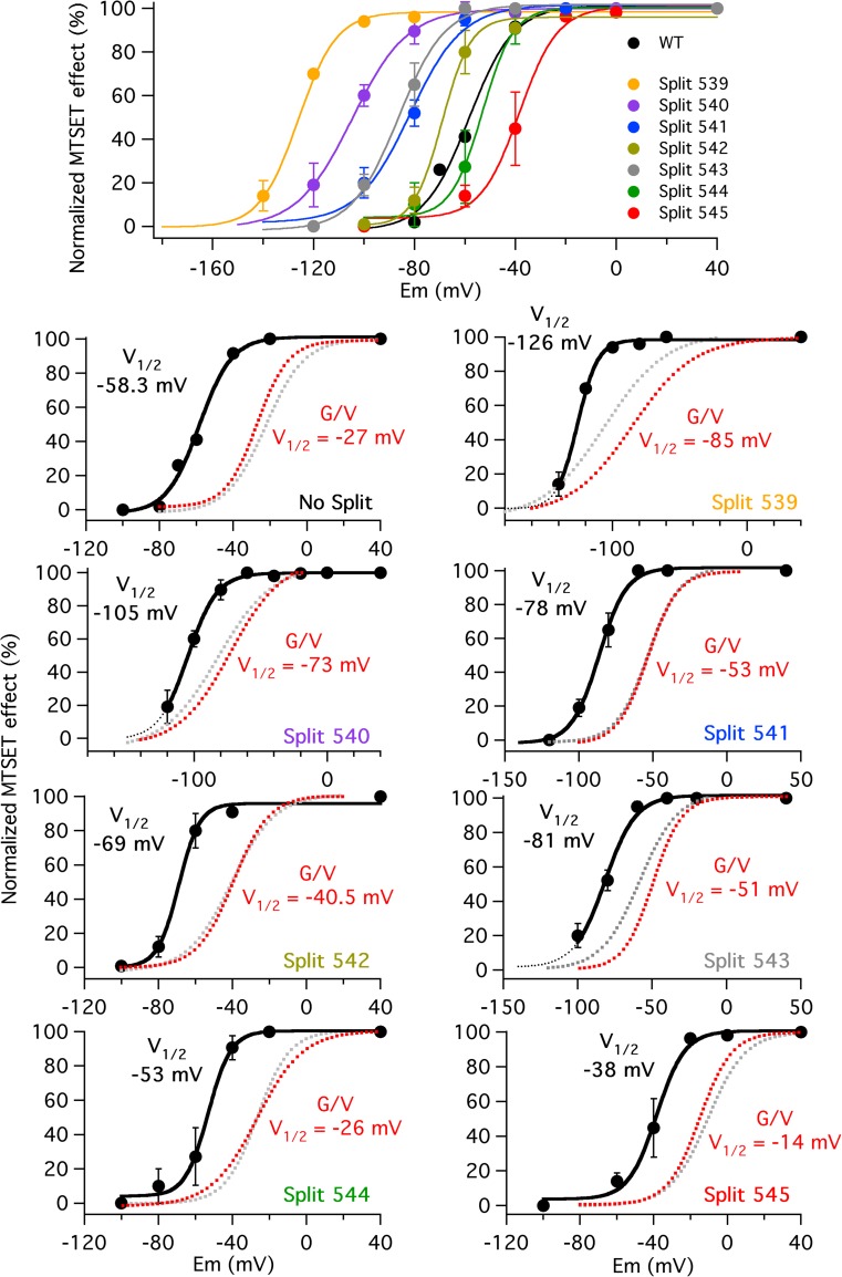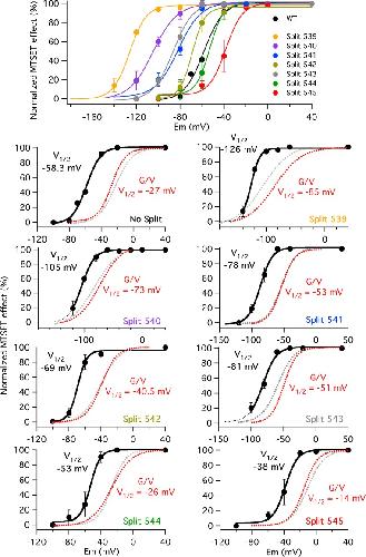 Fig. 7. Effect of split position displacement on voltage dependence of MTSET availability to an engineered cysteine at position 521 in the extracellular part of the voltage sensor S4 helix. Summary of voltage dependence of the MTSET effect in different splits carrying the I521C mutation at the extracellular part of the voltage sensor S4 helix, as a function of the holding potential used during the MTS reagent exposure (upper panels). Plots of voltage dependence of the MTSET effect in the individual splits tested (lower panels). Magnitudes of MTSET-induced variations in current kinetics during test ramps as indicated in âMaterials and methodsâ section following a 2-min exposure to 1Â mM of the MTS reagent without pulsing at the holding potentials indicated in the abscissa were normalized to those observed at a positive potential value of +â40Â mV. Due to the irreversibility of the MTSET effects, only one reagent application was performed and a single holding potential value (followed by a positive control at +â40Â mV) was checked in each cell studied. Data from three to six cells were averaged for every single point. Some error bars are smaller than the symbols. Continuous lines correspond to fits using a Boltzmann function as indicated in âMaterials and methodsâ section. The corresponding V 1/2 values are shown on the graphs. G/V plots from the same constructs obtained from fits to tail current data and V 1/2 values derived from them are also shown in red. Note the similarity of these plots and those from the same splits without the I521C plus C445V and C449V mutations (gray dotted lines; reproduced from Fig. 1d) |