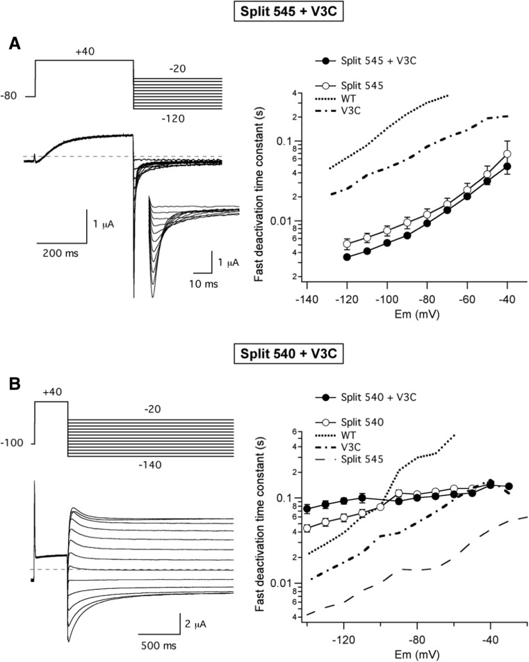 Fig. 5. Deactivation kinetics of channels split at the beginning or the end of the S4âS5 linker are not modified by a mutation in residue 3 of the Kv11.1 N-tail. a Deactivation characteristics of split 545 channels carrying a V3C mutation in the N-tail of the N-terminal demi-channel. A representative family of currents is shown on the left, obtained with the protocol shown on top of the currents. A high-K+ extracellular solution was used to maximize the currents due to the small current magnitudes obtained with the split 545 + V3C construct (see âMaterials and methodsâ section). Only the first part of the 4-s repolarization steps is shown. An expanded view of the initial part of the tails is shown in the inset. The dependence of deactivation rates on repolarization membrane potential is shown on the right. Only the magnitude of the deactivation time constant corresponding to the fast decaying major component of current at negative voltages is shown. Data from WT, the full-length V3C mutant and non-mutated split 545 channels also recorded in high-K+ are shown for comparison as indicated. b Deactivation characteristics of split 540 channels carrying a V3C mutation in the N-tail of the N-terminal demi-channel. A representative family of currents is shown on the left. The dependence of deactivation rates on repolarization membrane potential is shown on the right. Data from WT, full-length V3C and non-mutated split 540 and split 545 channels are also shown for comparison |