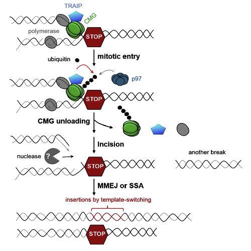 Figure 7. Model of CMG Unloading, Fork Breakage, and Complex DNA Rearrangements upon Premature Mitotic Entry |
