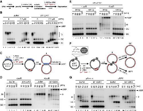 Figure 1. Mitotic CDK Triggers Aberrant Processing of Stalled DNA Replication Forks in Xenopus Egg Extracts (A) Schematic of the experimental approach to test the effect of B1-CDK1 on DNA replication. APH, aphidicolin. (B) A 3-kb pBlueScript plasmid was replicated according to (A), and products were separated on a native agarose gel followed by autoradiography. Unless stated otherwise, the 0 minute time point refers to NPE addition. (C) Schematic of DNA replication for the LacR-bound p[lacO48] plasmid. (D) p[lacO48] was replicated according to (C) under the indicated conditions. (E) p[lacO48] was replicated according to (C) in the absence or presence of LacR and IPTG (10 mM, 15 min incubation in NPE before mixing with the licensing mixture), as indicated. (F) Schematic of replication for pDPC, containing four 46-kDa M.HpaII DNA methyltransferases at the indicated positions. Products formed in the presence and absence of B1-CDK1 are indicated. (G) pControl or pDPC was replicated according to (F) using the indicated conditions. From (A) to (G), B1-CDK1 was added to the licensing mixture at a concentration of 50 ng/μL, and its final concentration in the overall reaction was 16.7 ng/μL (STAR Methods). RI, replication intermediate; OC, open circle; SC, supercoil; θ, theta structure; ARP, aberrant replication product. See also Figure S1. |