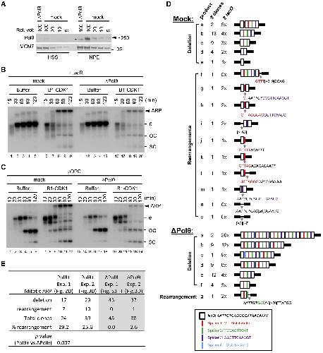 Figure 3. Depletion of DNA Polymerase θ Disrupts the Generation of Aberrant Replication Products in the Presence of Mitotic CDK (A) Mock-depleted and DNA polymerase θ (Polθ-depleted Xenopus egg extracts were blotted for Polθ and MCM7 alongside a serial dilution of mock-depleted extracts. Asterisk, background band. (B) LacR-bound p[lacO48] was replicated in mock-depleted or Polθ-depleted extracts with or without B1-CDK1 treatment. Total DNA replication and ARP are quantified in Figure S3F. (C) pDPC was replicated in mock-depleted or Polθ-depleted egg extracts with or without B1-CDK1 treatment. Total DNA replication and ARP are quantified in Figure S3G. (D) Structure of clones derived from mitotic ARPs in mock- or Polθ-depleted extracts. LacR-bound p[lacO48] was replicated in mock- or Polθ-depleted extracts with B1-CDK1 treatment. Shown is the smear of â¼3- to 4-kb mitotic DNA replication products generated after AlwNI digestion was self-ligated, cloned, and sequenced. Elements in the box at the bottom show the sequences of lacO and spacers. (E) Comparison of mitotic ARP-derived clones in the presence or absence of Polθ. Mock depletion (Figure 2D) and Polθ depletion (Figure S3H) in experiment 1 (Exp. 1) were performed independently, whereas they were performed side by side (Figure 3D) in Exp. 2. The p value was from an unpaired two-tailed Studentâs t test. See also Figure S3. |