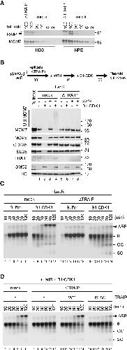 Figure 5. The E3 Ubiquitin Ligase TRAIP Promotes Mitotic CMG Unloading from a Stalled Replication Fork (A) Mock-depleted and TRAIP-depleted egg extracts were blotted for TRAIP and MCM7 alongside a serial dilution of mock-depleted extracts. Asterisk, background band. (B) The LacR-bound p[lacO48] plasmid was replicated in mock-depleted or TRAIP-depleted egg extracts and treated as schemed. Chromatin-bound proteins were recovered and blotted with the indicated antibodies. (C) LacR-bound p[lacO48] was replicated in mock-depleted or TRAIP-depleted extracts with or without B1-CDK1 treatment. (D) LacR-bound p[lacO48] was replicated in mitotic mock-depleted or TRAIP-depleted egg extracts with or without recombinant wild-type TRAIP (rTRAIPWT) or R18C mutant (rTRAIPR18C), as indicated. rTRAIPWT and rTRAIPR18C were added to NPE at a concentration of 21 ng/μL (â¼7-fold over endogenous TRAIP; see quantification in Figure S5C). Matched buffer without recombinant protein was added to control reactions. Addition of rTRAIPWT at the endogenous level (Figure S5C) into TRAIP-depleted extracts also led to substantial rescue of mitotic ARPs (Figures S5D and S5E). See also Figure S5. |
