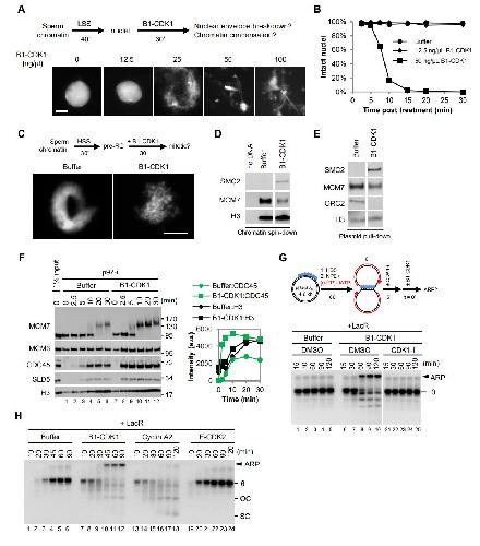 Figure S1, related to Figure 1. (A) To determine the concentration of mitotic B1-CDK1 that efficiently induces nuclear envelope breakdown and chromatin condensation, de-membranated Xenopus sperm chromatin was incubated in LSS (low speed supernatant) for 40 minutes to allow the formation of pseudo nuclei. The indicated final concentrations of B1-CDK1 were then added into the reactions for 30 minutes before Hoechst staining and imaging. 50 ng/µL of B1-CDK1 was sufficient to induce nuclear envelope breakdown and chromatin condensation and it was used for subsequent experiments unless otherwise indicated. Scale bar, 10 µm.(B) Percentage of intact nuclei remaining at the indicated time points after treatment with the indicated concentration of B1-CDK1 (n>1,000). The â0 minuteâ time point refers to Buffer or B1-CDK1 addition. The value at each time point was normalized to the value at 0 minute in each treatment. (C) Chromatin condensation assay in membrane-free HSS. Sperm chromatin was incubated in HSS for 30 minutes, and then treated with 50 ng/µL of B1-CDK1 for 30 minutes followed by Hoechst staining and imaging. Scale bar, 10 µm. (D) Sperm chromatin spin-down assays in HSS. Sperm chromatin was incubated with HSS for 30 minutes and treated with Buffer or 50 ng/µL of B1-CDK1 for another 30 minutes. Chromatin DNA was recovered and chromatin-bound proteins were blotted with indicated antibodies. Unrelated lanes were cropped as indicated by the gap. (E) Plasmid pull-down assays in HSS. pBlueScript (3 kb) was incubated with HSS at a concentration of 7.5 ng/µL for 30 minutes and treated with Buffer or 50 ng/µL of B1-CDK1 for another 30 minutes. Plasmid was recovered and chromatin-bound proteins were blotted with indicated antibodies. Unrelated lanes were cropped as indicated by the gap. (F) Plasmid pull-down assay to assess origin firing. pBlueScript was incubated with HSS for 30 minutes and treated with buffer or 50 ng/µL of B1-CDK1 for another 30 minutes before addition of NPE. The p97 inhibitor NMS-873 (p97-i) was added into NPE (final concentration, 266 µM) and incubated for 15 minutes. Treatment of p97-i blocked the unloading of CMG helicases from chromatin and trapped ubiquitylated MCM7 on chromatin, seen as a smear. Right panel shows the quantification of the CDC45 and Histone H3 signals. Increased CDC45 loading with B1-CDK1 treatment suggested more origin firing. (G) LacR-bound p[lacO48] was replicated in interphase egg extracts for 60 minutes and then treated with DMSO or CDK1 kinase inhibitor (CDK1-i, 333 µM RO-3306) for 5 minutes before the addition of Buffer or 50 ng/µL of B1-CDK1. At the indicated times, samples were withdrawn and replication products were tracked by electrophoresis and autoradiography. ARP, aberrant replication product; θ, theta structure. (H) LacR-bound p[lacO48] was replicated in the presence of B1-CDK1, Cyclin A2 and cyclin E-CDK2, with a final concentration of 50 ng/µL, respectively. OC, open circle; SC, supercoil; θ, theta structure; ARP, aberrant replication product. |