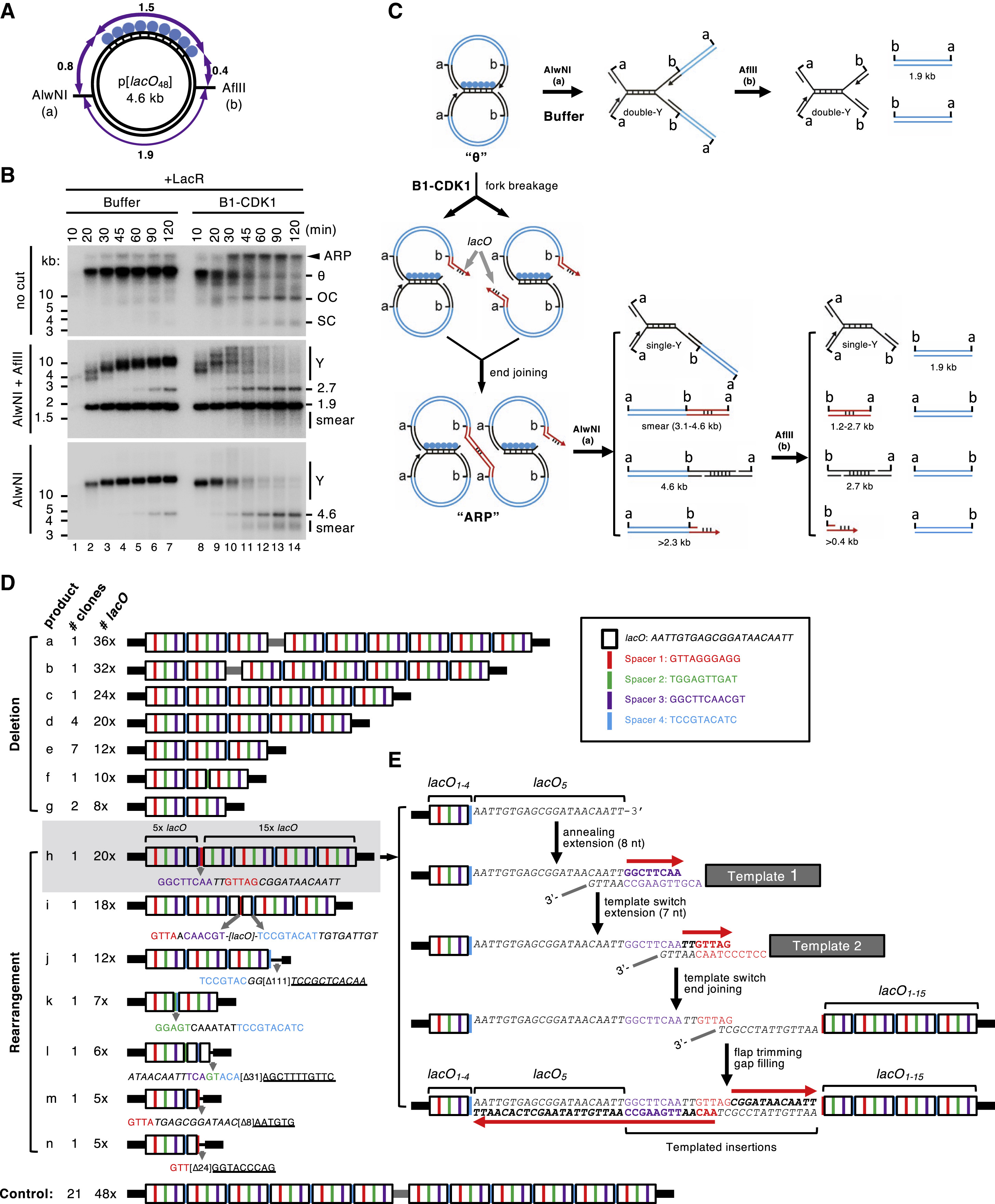 Figure 2. Mitotic Processing of Stalled Replication Forks Leads to Complex DNA Rearrangements (A) Structure of the 4.6-kb p[lacO48] plasmid. Numbers mark the length of the indicated DNA segments in kilobase pairs. (B) p[lacO48] was replicated in the presence of buffer or B1-CDK1. At the indicated time points, replication products were isolated and digested with AlwNI and AflII or AlwNI as indicated. Numbers label the size of linear fragments in kilobase pairs. Y, double-Y or single-Y structure (see C). (C) Model explaining the restriction products observed in (B). Although the model favors fork breakage on the leading strand, the possibility of fork breakage on the lagging strand has not been excluded. A more detailed model is presented in Figure S2A. (D) The smear of â¼3- to 4-kb mitotic DNA replication products generated after AlwNI digestion in (B) was self-ligated, cloned, and sequenced. The controls are replication products of the same plasmid from a mitotic reaction lacking LacR. The lacO repeats, shown as white boxes, are separated by four unique spacers shown in different colors. Inset, DNA sequences of the lacO repeat and four spacers. The detailed structure of the entire lacO array is shown in Figure S2C. (E) A model for the generation of product h in (D) from multiple template-switching events. See also Figure S2. |