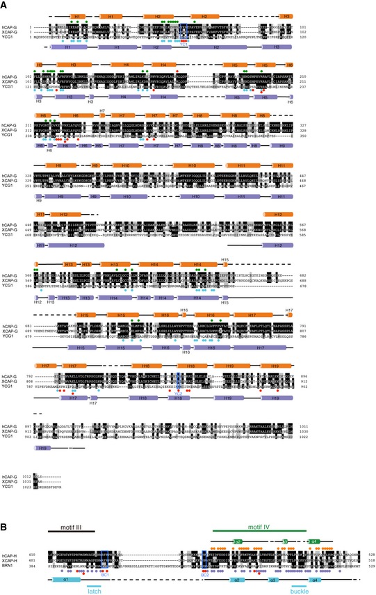 17.Structure‐based sequence alignment of hCAP‐H, XCAP‐H, and BRN1. The secondary structural elements of hCAP‐H and BRN1 are drawn above and below the sequence alignments, respectively. Identical and homologous residues are shown on black and gray backgrounds, respectively. The colored circles indicate residues of hCAP‐H that interact with hCAP‐G (orange) and residues of BRN1 that interact with YCG1 (purple) or dsDNA (red). BC1, BC2, latch, and buckle regions defined by Kschonsak et al