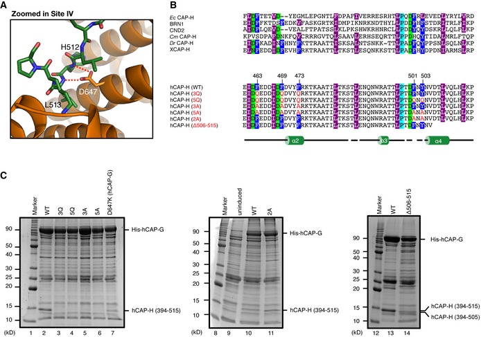 Zoomed‐in view of site IV. Residues of hCAP‐G and hCAP‐H are shown in orange and green, respectively. The dashed red lines indicate hydrogen bonds.3Q, 5Q, 3A, 5A, 2A, and Δ506–515 mutants of hCAP‐H. Motif IV (residues 461–503) contains amino acid residues highly conserved among eukaryotic species (X, Xenopus laevis; Dr, Danio rerio; Cm, Cyanidioschyzon merolae; Sp, Schyzosaccharomyces pombe; Sc, Saccharomyces cerevisiae; Ec, Encephalitozoon cuniculi). To produce the IV‐3Q, 5Q, 3A, 5A, and 2A mutants, the conserved aromatic amino acid residues (F463, F469, F473, F501, and Y503; labeled in dark blue) were substituted with glutamine (Q) or alanine (A) residues. The secondary structural element of hCAP‐H is drawn below the sequence alignments.Interaction analysis between hCAP‐G and hCAP‐H. Bacterial cell lysates co‐expressing hCAP‐G (residues 1–478, 554–900) and hCAP‐H (residues 394–515), either wild type (WT; lanes 2, 10 and 13), 3Q (F463Q, F469Q and F473Q; lane 3), 5Q (F463Q, F469Q, F473Q, F501Q and Y503Q; lane 4), 3A (F463A, F469A and F473A; lane 5), 5A (F463A, F469A, F473A, F501A and Y503A; lane 6), or 2A (F501A and Y503A; lane 11), or a C‐terminal deletion mutant (506–514 residues were deleted from 394–515; lane 14) were applied to Ni‐NTA agarose resin, and the bound fraction was analyzed by SDS–PAGE. Alternatively, a cell lysate co‐expressing mutant hCAP‐G (D647K) and wild‐type hCAP‐H was examined (lane 7). The uninduced cell lysate was also used as a negative control (lane 9).