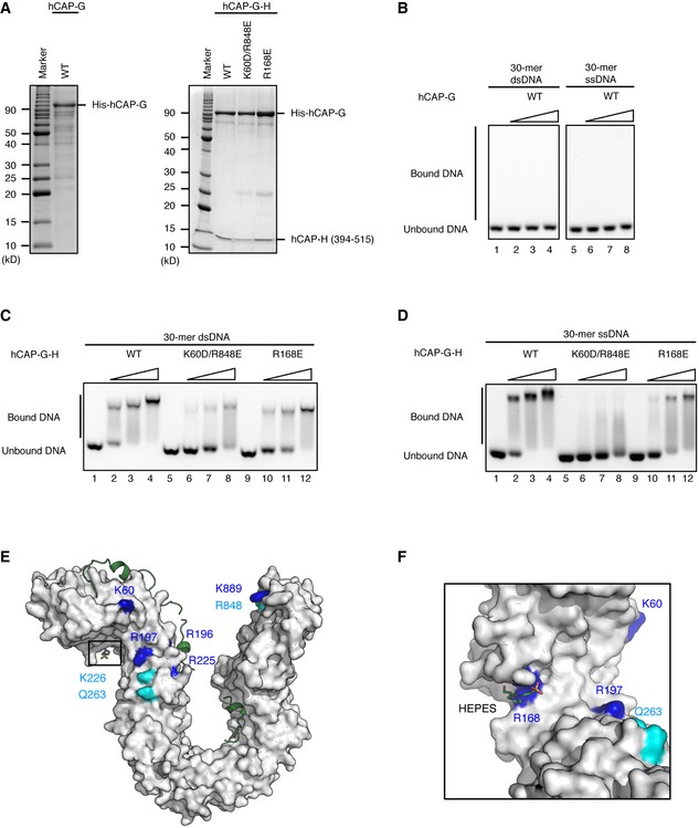 Purification of hCAP‐G and hCAP‐G‐H subcomplexes: wild type (WT), CAP‐G K60D/R848E double mutant (K60D/R848E), and CAP‐G R168E mutant (R168E). Purified protein samples were subjected to SDS–PAGE and analyzed by CBB staining.Double‐stranded DNA (dsDNA) and single‐stranded DNA (ssDNA)‐binding assay of the hCAP‐G. 30‐bp dsDNA was incubated with no protein (lanes 1) or increasing amounts of WT hCAP‐G (WT; lanes 2–4). 30‐mer ssDNA was incubated with no protein (lanes 5) or increasing amounts of WT hCAP‐G (WT; lanes 6–8).The dsDNA binding assay for the hCAP‐G‐H subcomplexes. 30‐bp dsDNA was incubated with no protein (lanes 1, 5, and 9), increasing amounts of WT hCAP‐G‐H subcomplex (WT; lanes 2–4), CAP‐G K60D/R848E double mutant (K60D/R848E; lanes 6–8), or CAP‐G R168E mutant (R168E; lanes 10–12).The ssDNA binding assay for the hCAP‐G‐H subcomplexes used in panel (C).The molecular surface of hCAP‐G in complex with hCAP‐H. The structural model of hCAP‐G is shown in white. hCAP‐H is shown as a green ribbon model. Identical and homologous residues between hCAP‐G and YCG1 are shown in blue and cyan, respectively.Zoomed‐in view of the HEPES‐binding site. R168 of hCAP‐H interacts with HEPES.